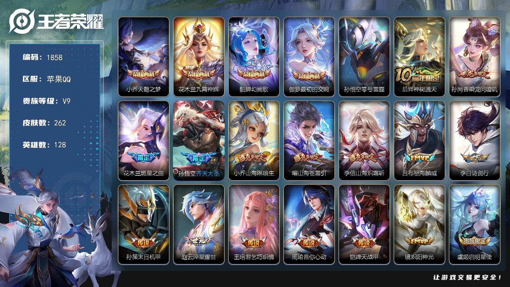 苹果Q-V8-最强王者段位-127英雄-153皮肤-3无双-4珍品传说-29传说