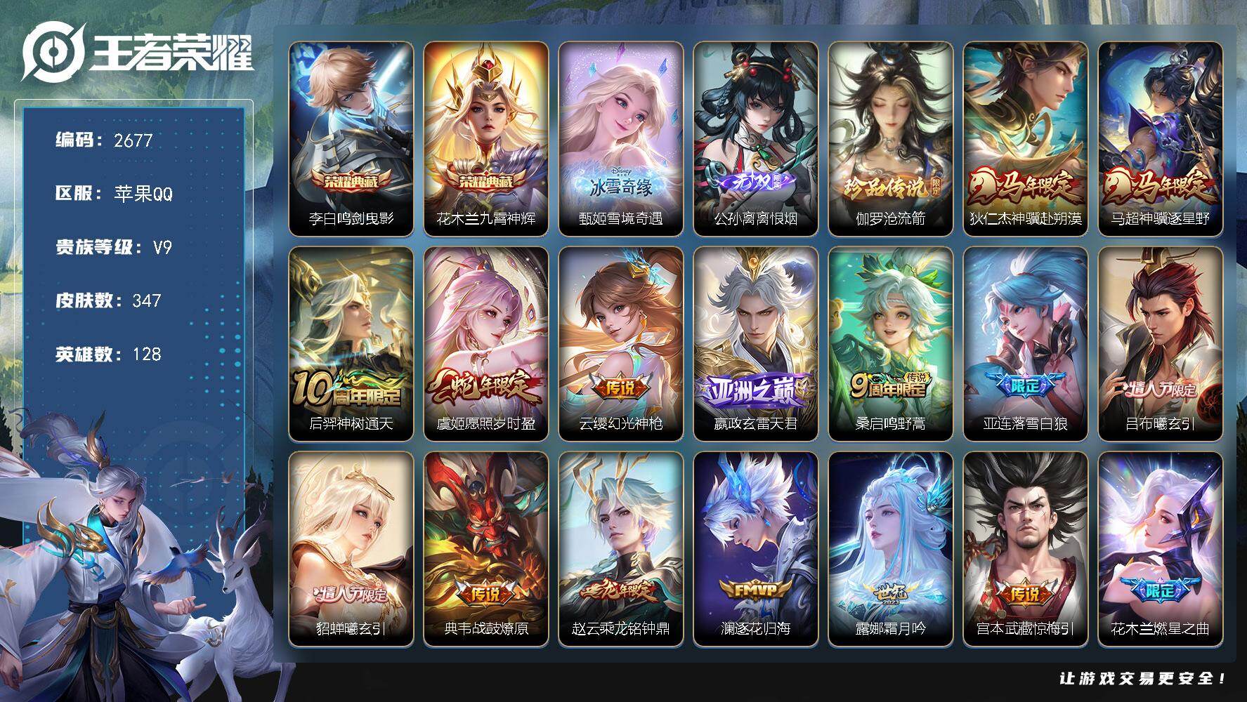 苹果Q-V9-最强王者段位-128英雄-416皮肤-2典藏皮肤-1无双-4珍品传