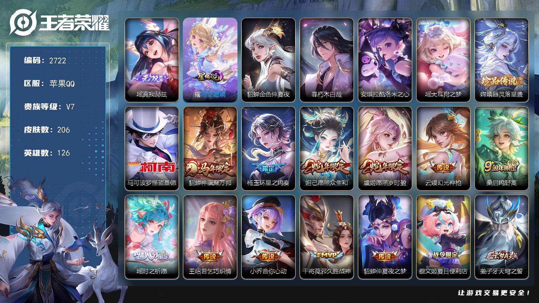 苹果Q-V8-最强王者段位-126英雄-186皮肤-1典藏皮肤-1无双-1珍品传