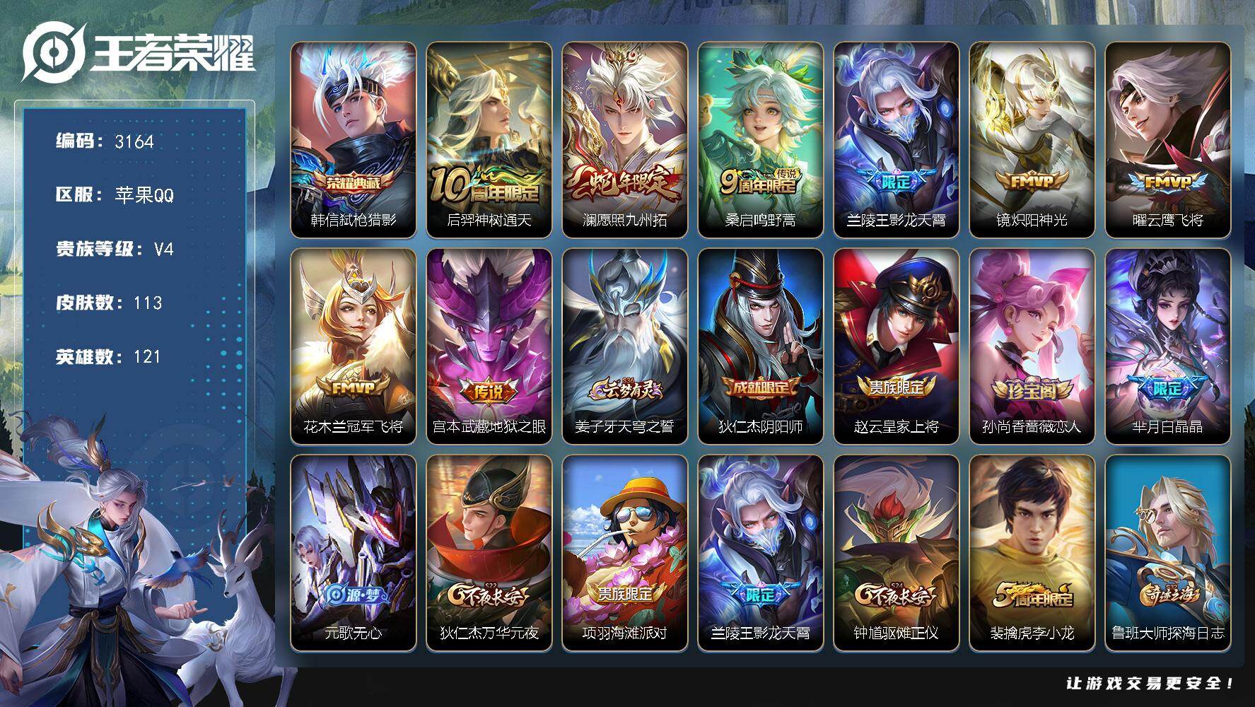 V4-最强王者段位-121英雄-113皮肤-1典藏皮肤-8传说-30史诗