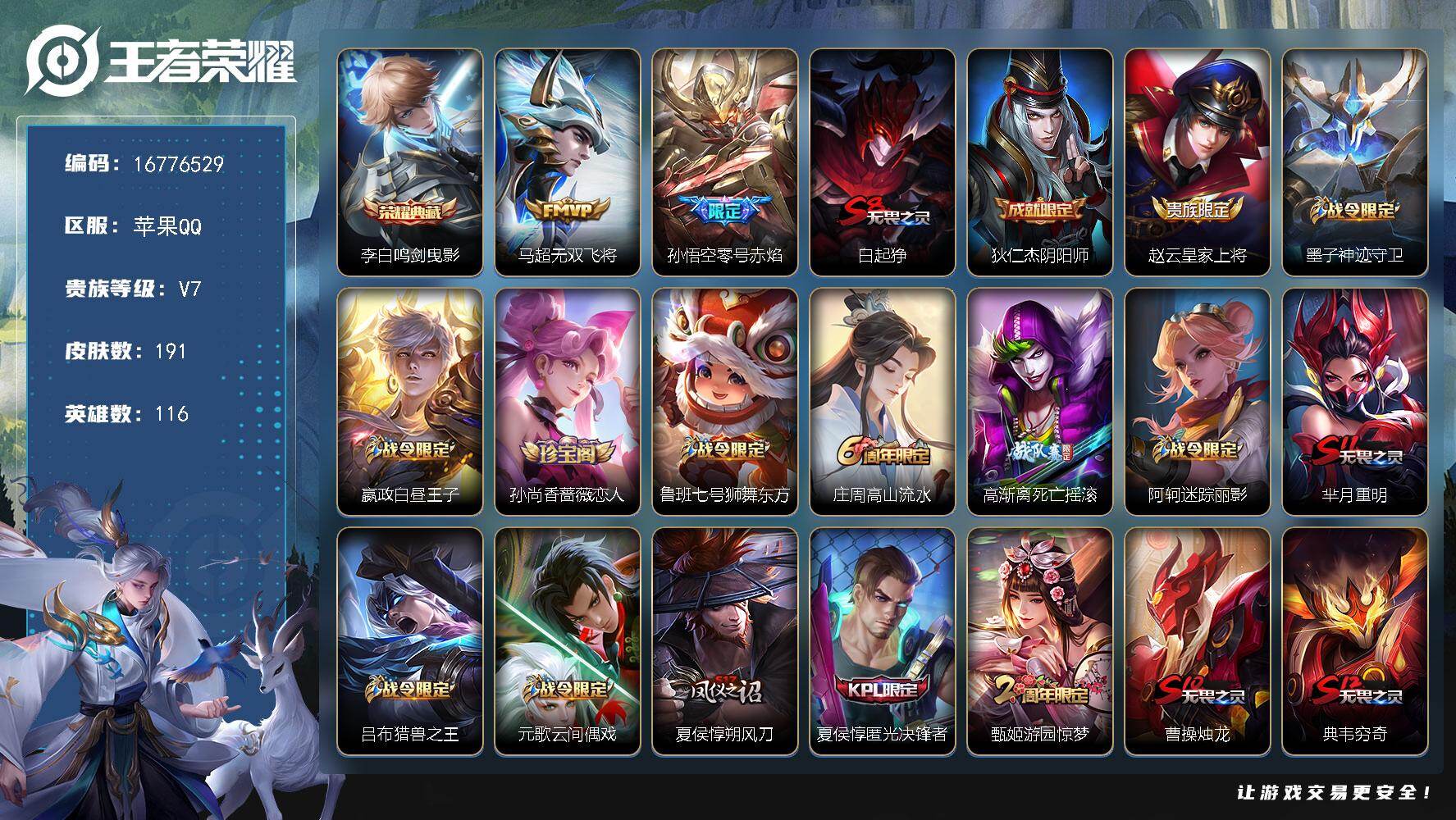 【16776529】苹果Q-V0-荣耀黄金III段位-116英雄-191皮肤-