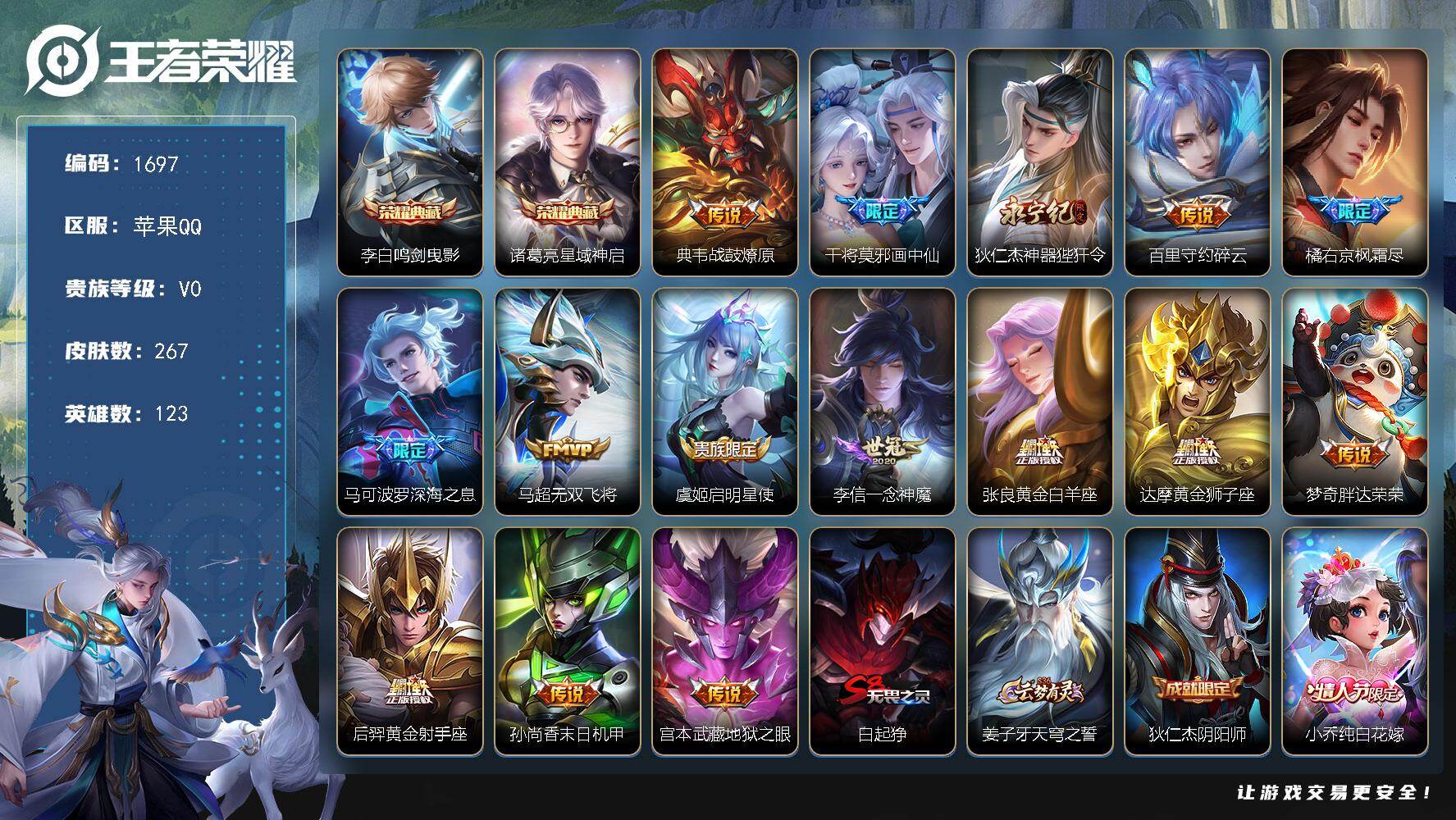 苹果QQ/传奇王者/297皮肤/128英雄/1典藏/0珍品无双/1无双/2珍品传说/13传说/83史