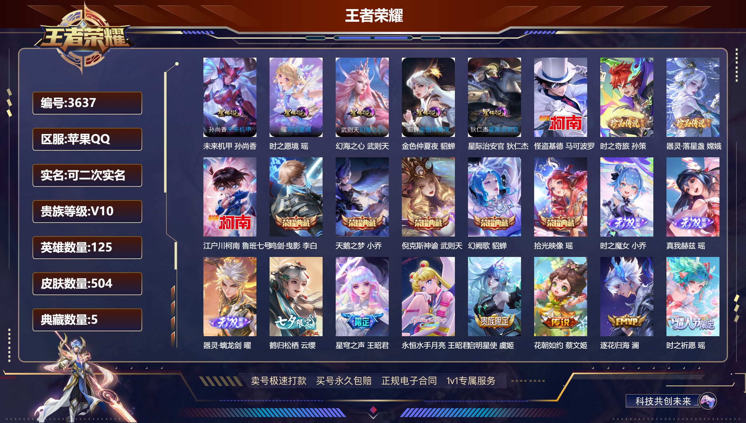 苹果QQ/荣耀王者/506皮肤/128英雄/4典藏/0珍品无双/2无双/0珍品传说/56传说/176