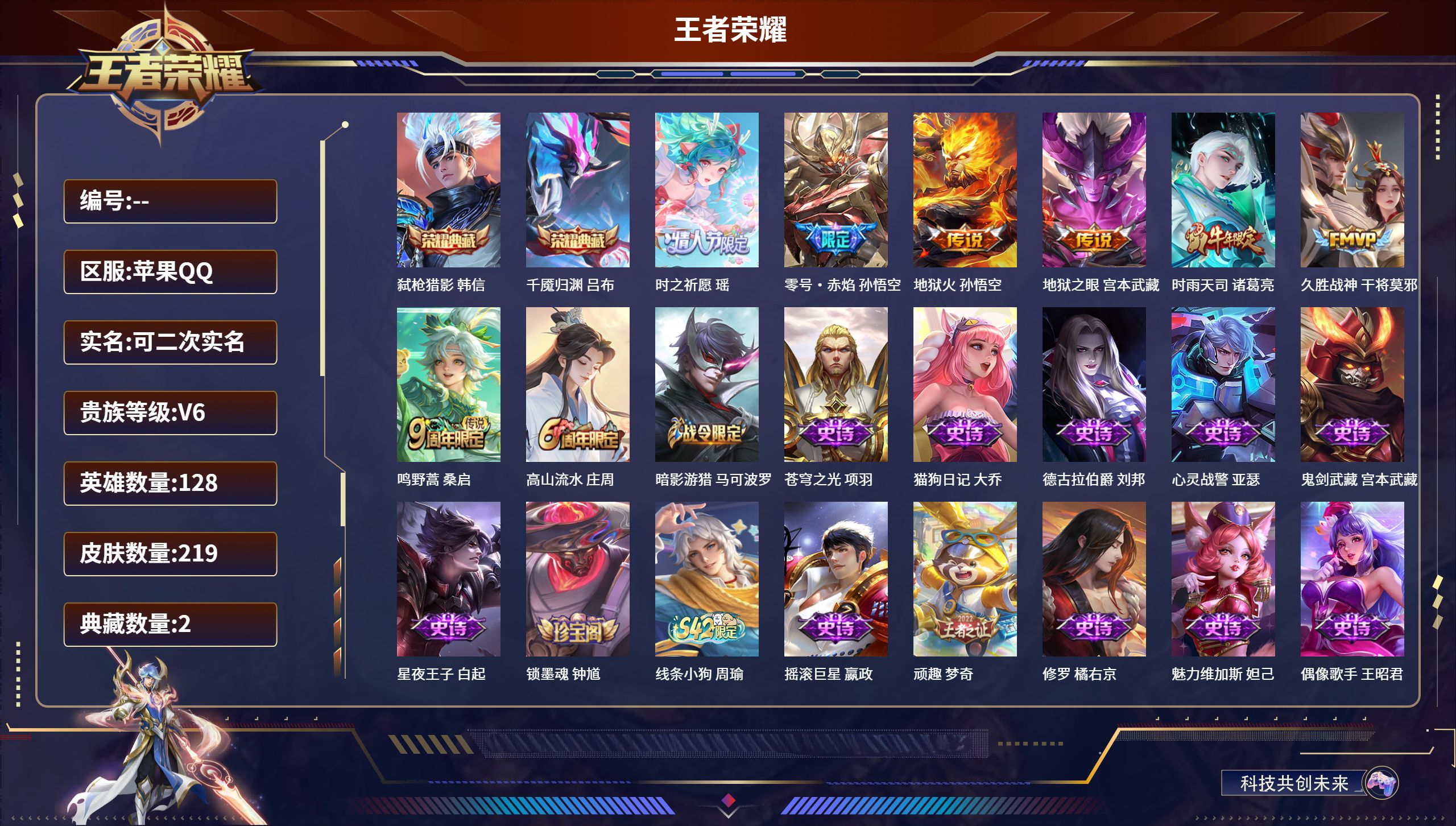 荣耀王者/219皮肤/128英雄/2典藏/0珍品无双/0无双/0珍品传说/7传说/51史诗/9稀有英雄