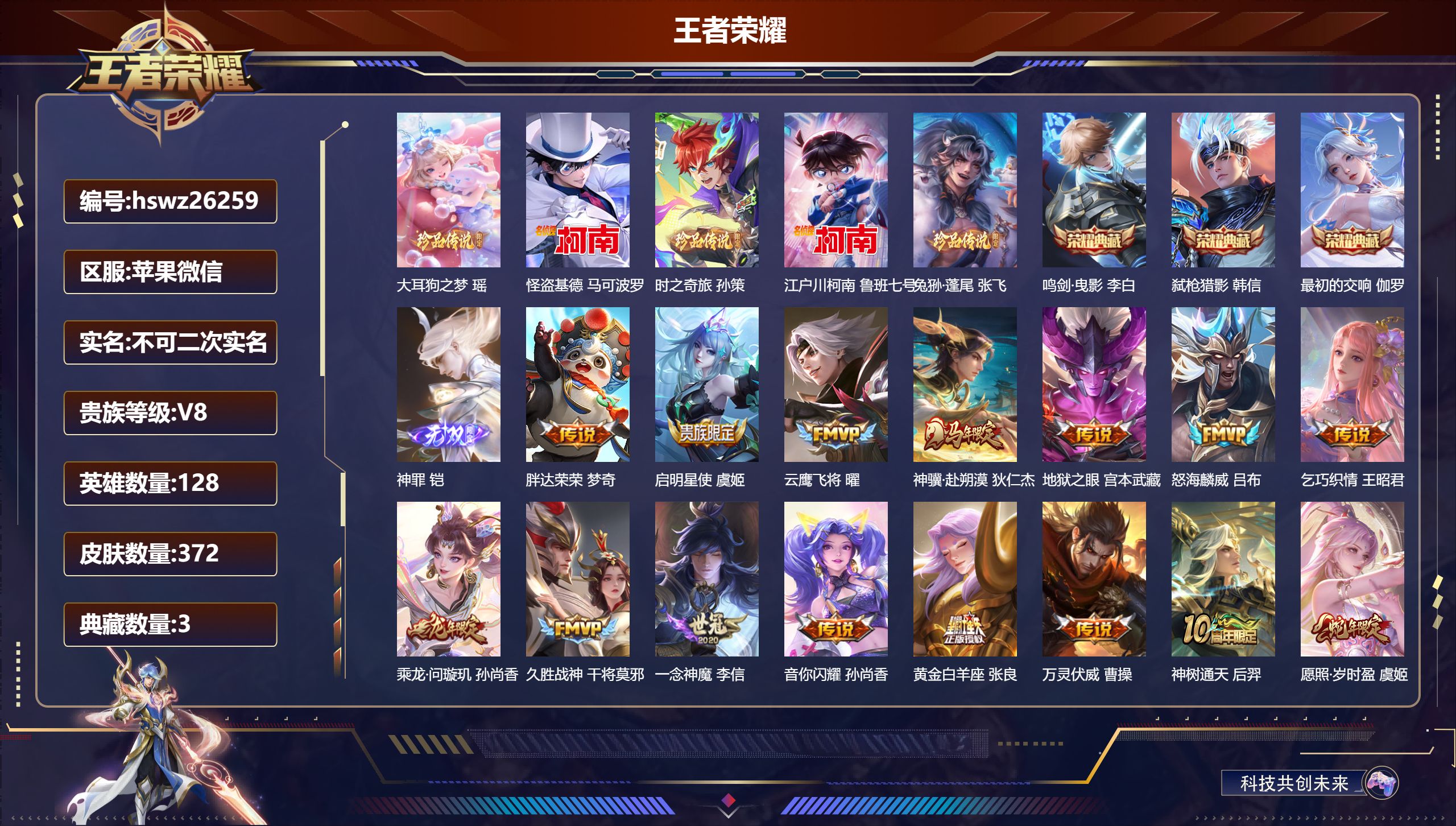 贵族8/皮肤298/典藏3/传说22/史诗93/英雄128/孙权全皮/敖隐全皮/