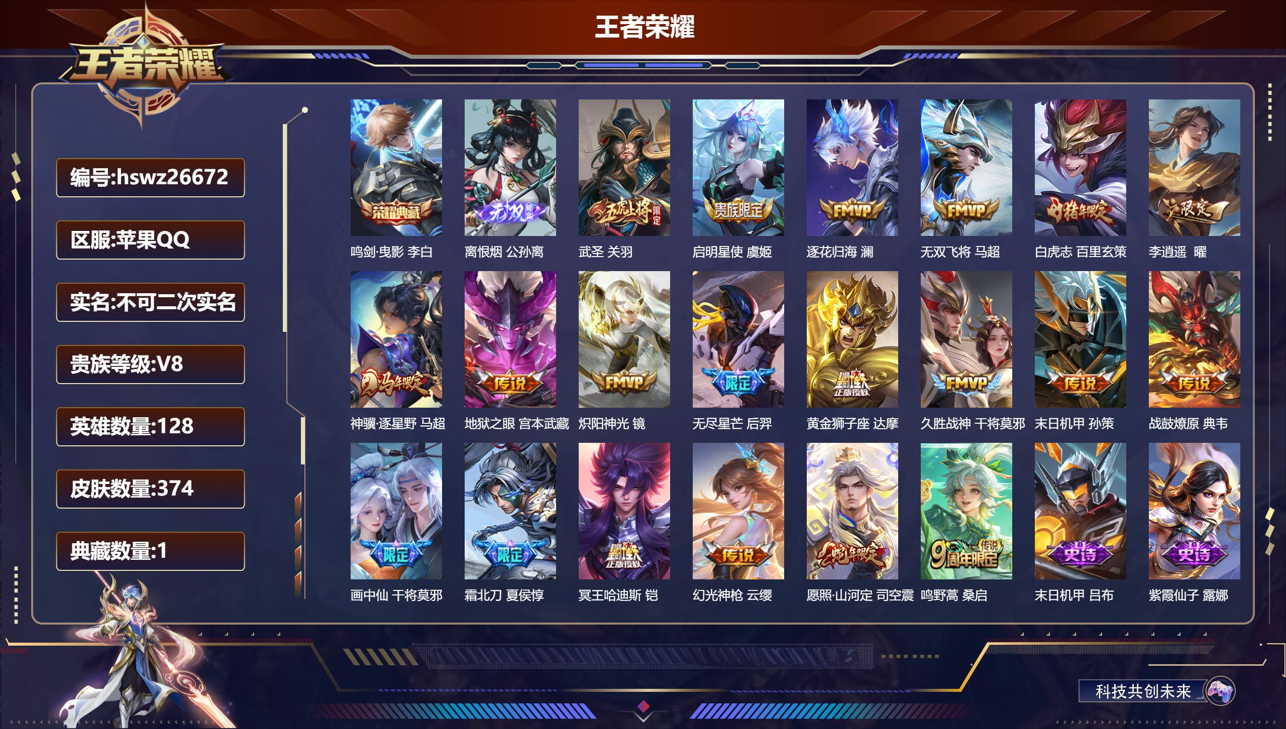 苹果QQ/荣耀王者/374皮肤/128英雄/1典藏/0珍品无双/1无双/0珍品传