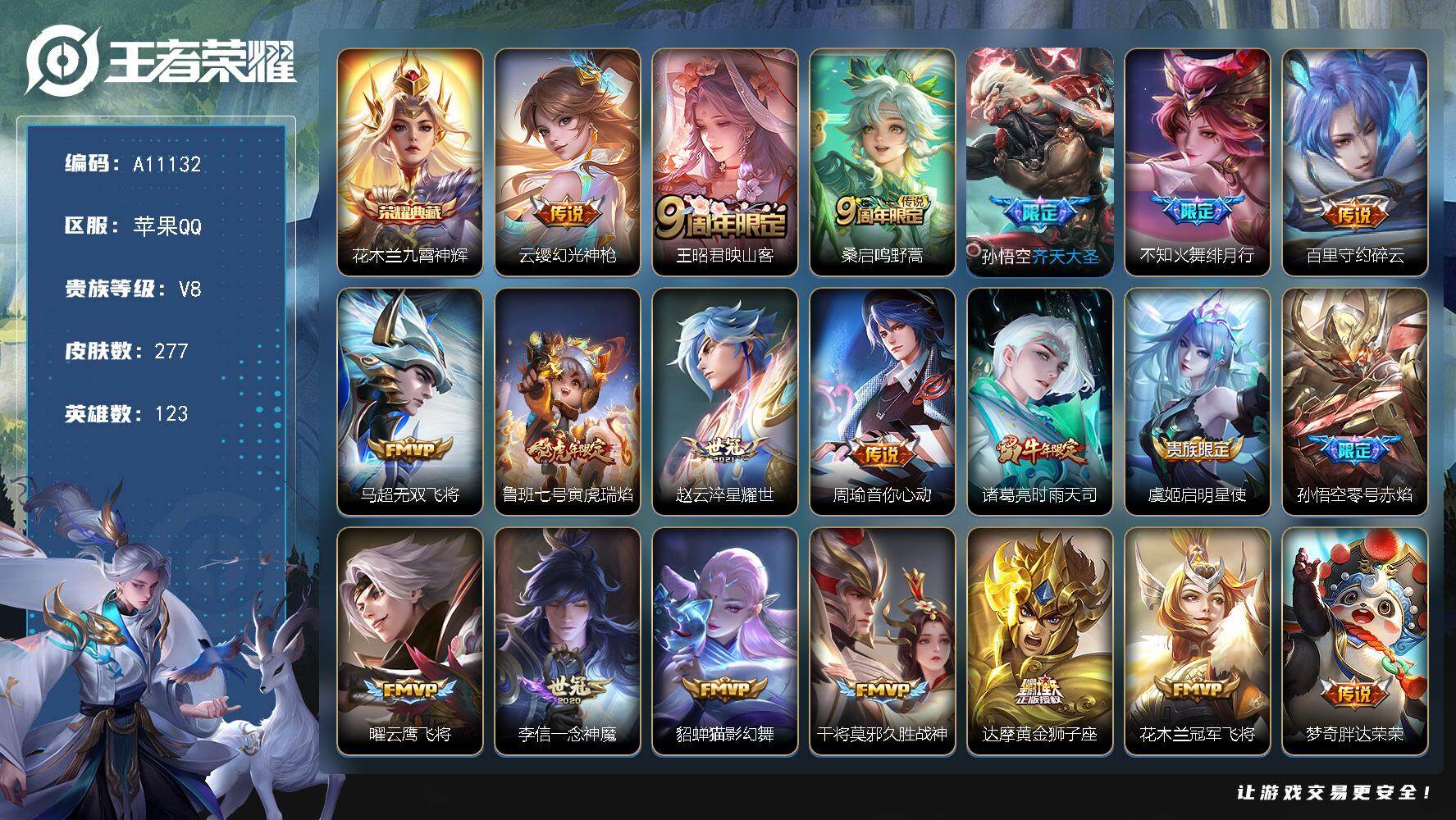 苹果Q-V0-至尊星耀I段位-123英雄-277皮肤-1典藏皮肤-22传说-80