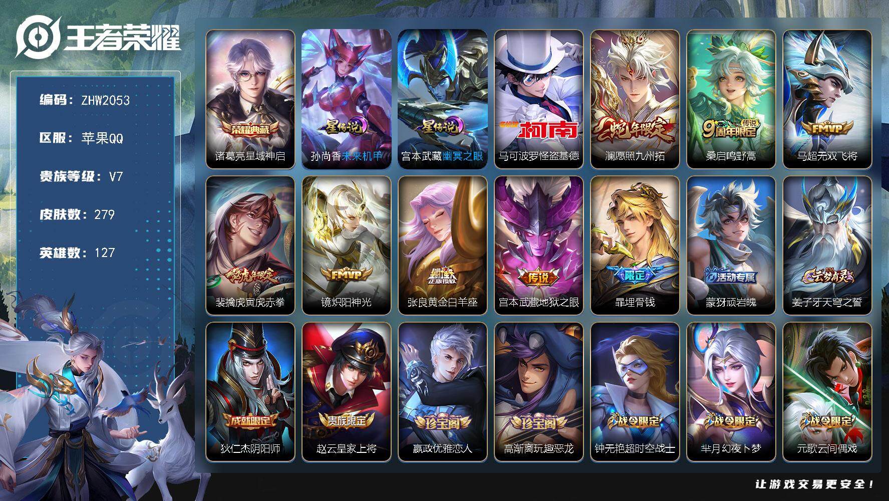 苹果Q-V7-最强王者段位-110英雄-172皮肤-19传说-55史诗【传说