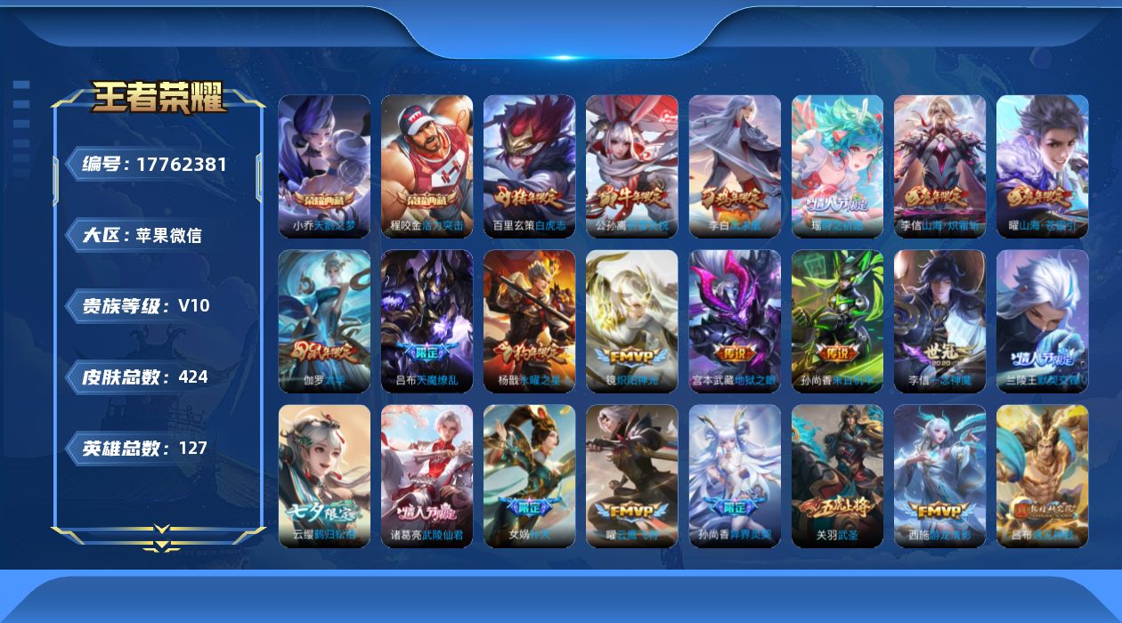 贵族等级: V7 英雄数: 127 皮肤数: 278 荣耀水晶: 全息碎影,弑