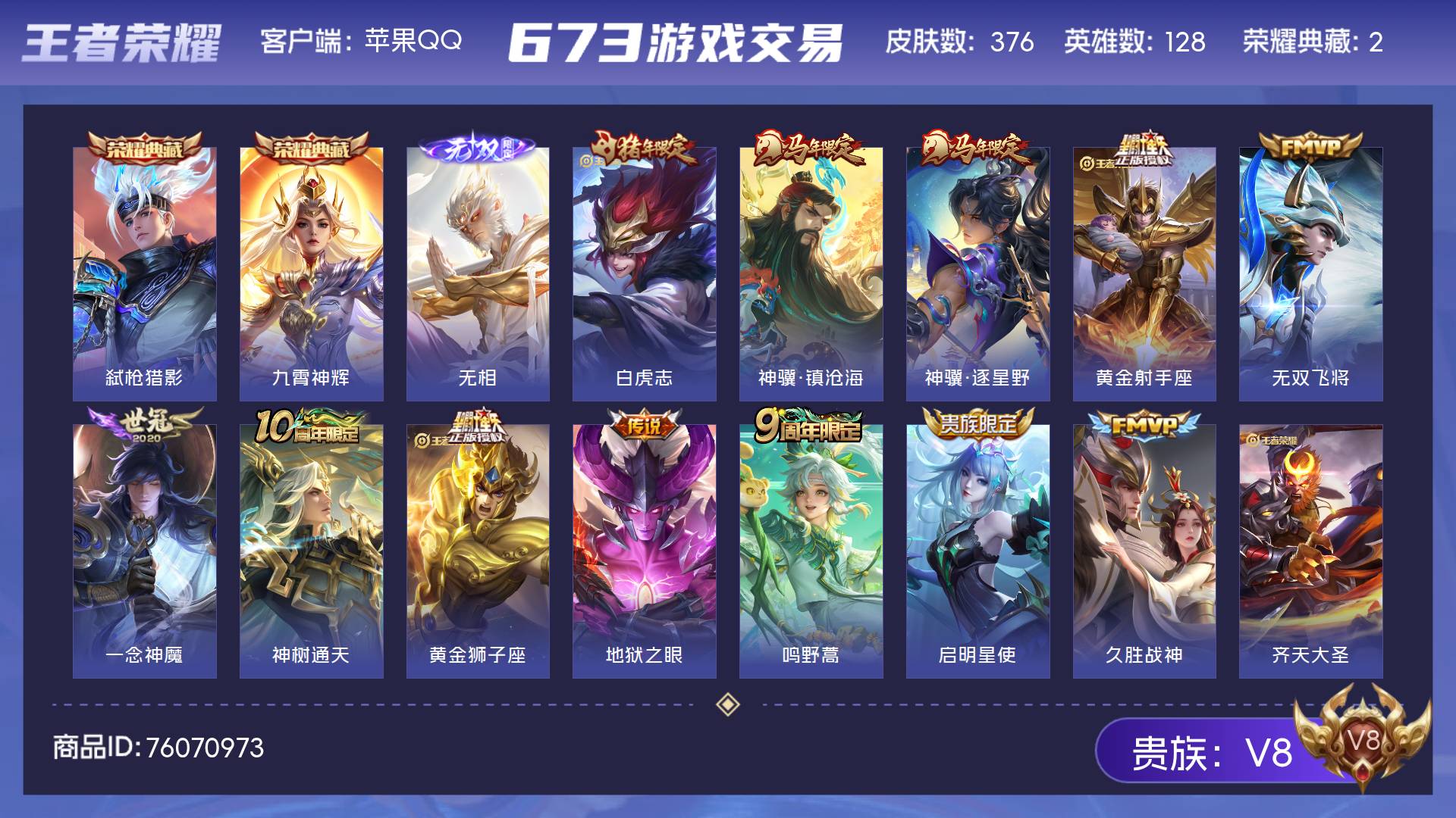 V8 皮肤376 英雄128 无双王者 荣耀典藏2 无双皮肤1 传说15 其他皮肤365