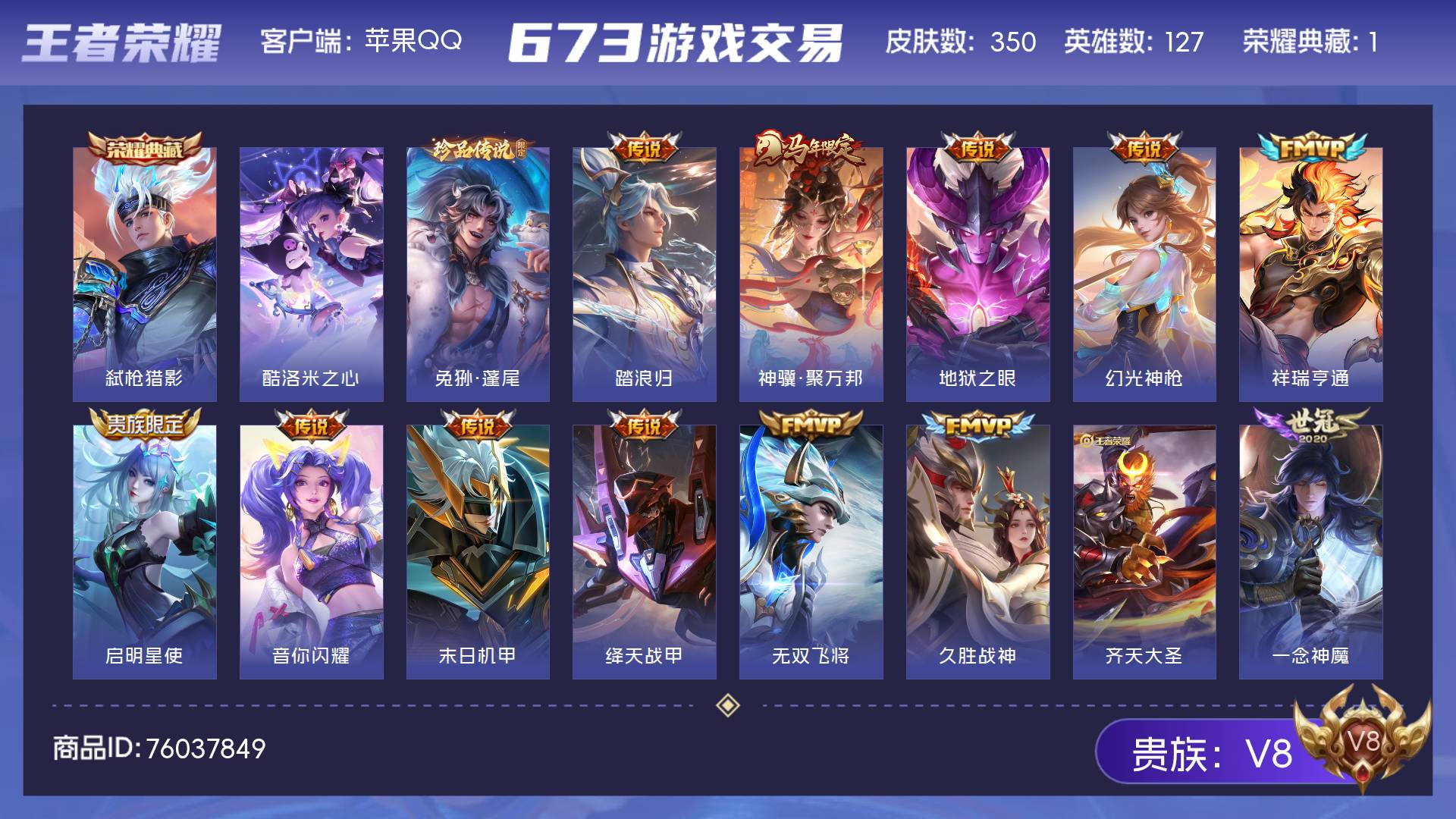 苹果Q-V10-最强王者段位-128英雄-520皮肤-4典藏皮肤-3无双-5珍品