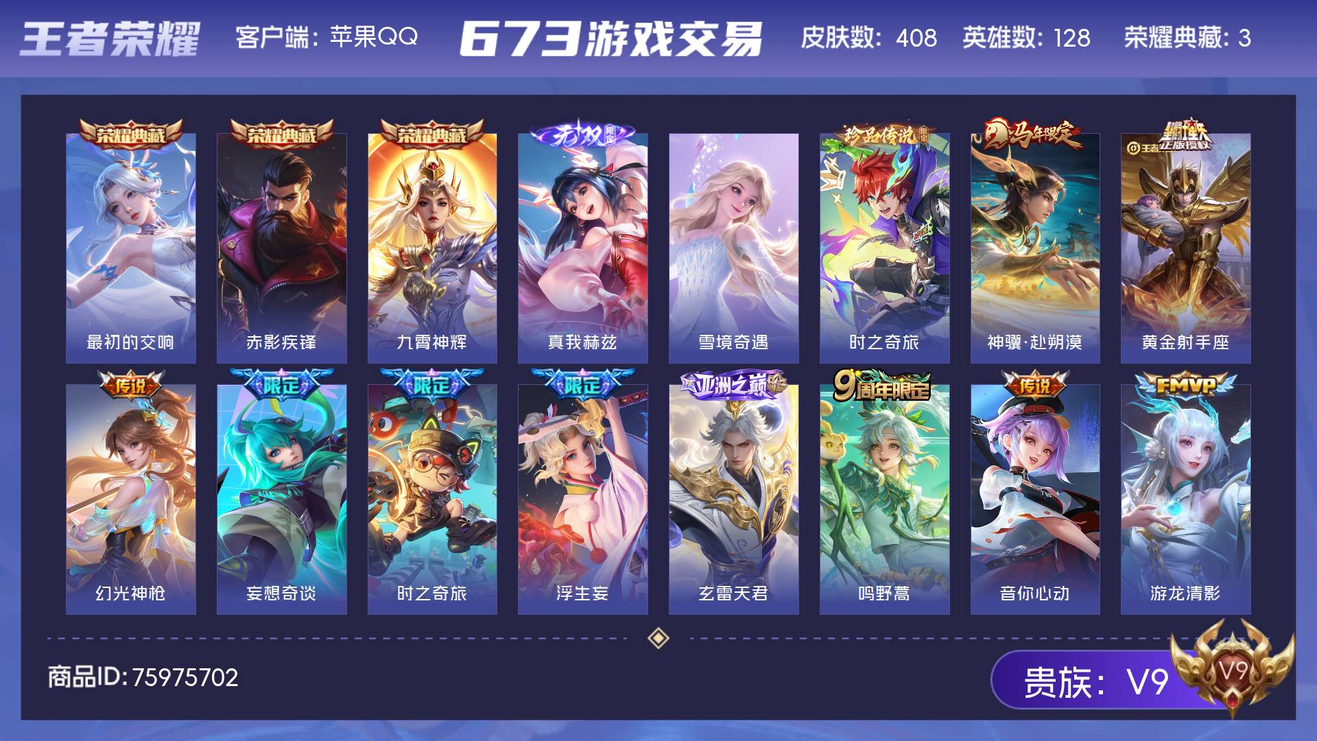 V9 皮肤408 英雄128 永恒钻石 荣耀典藏3 无双皮肤2 珍品传说1 传说28 其他皮肤380
