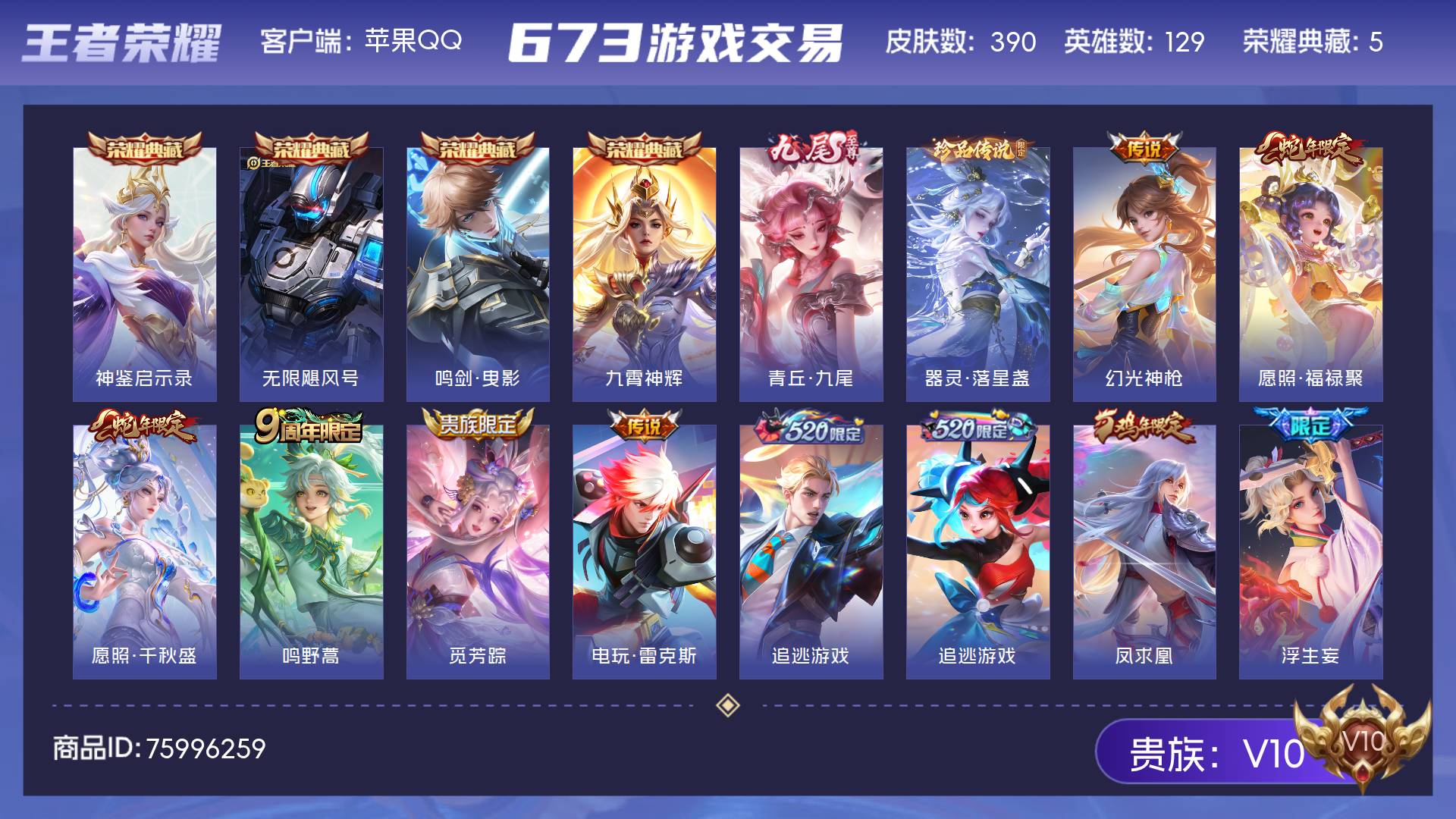 V10 皮肤390 英雄129 至尊星耀 荣耀典藏5 无双皮肤1 珍品传说1 传说53 其他皮肤338