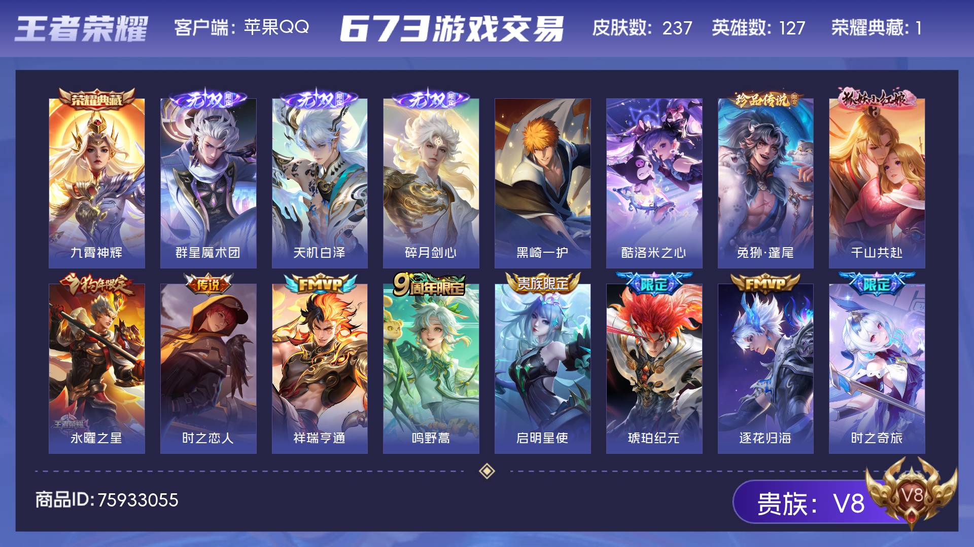V8 皮肤237 英雄127 至尊星耀 荣耀典藏1 无双皮肤3 珍品传说3 传说23 其他皮肤214