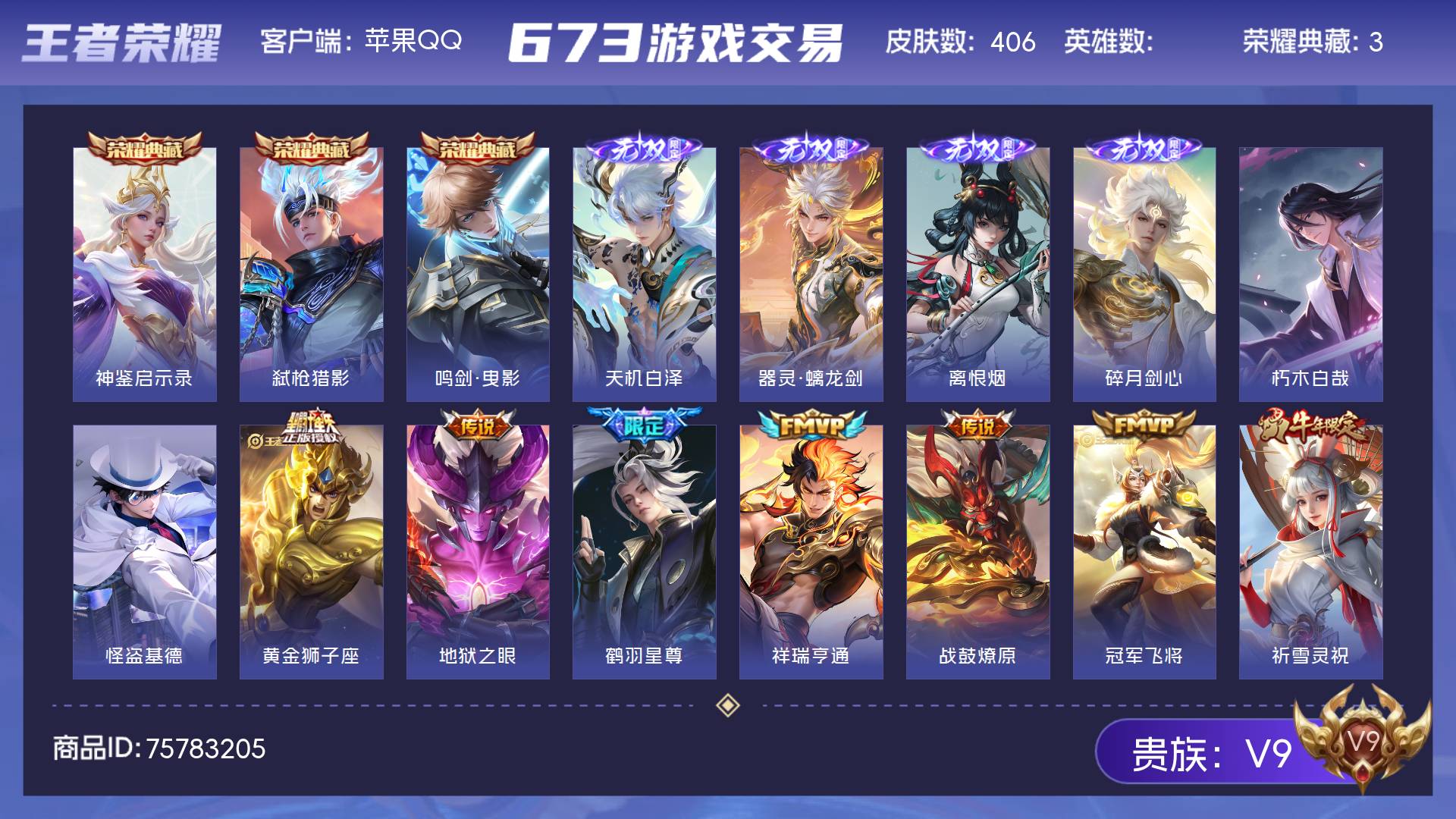V9 皮肤406 至尊星耀 荣耀典藏3 无双皮肤4 珍品传说2 传说41 其他皮肤360