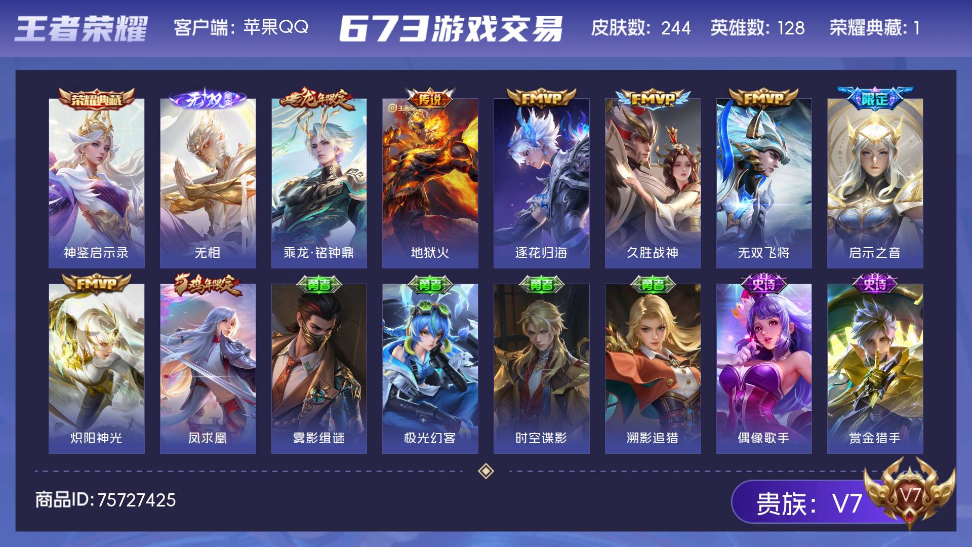 V7 皮肤244 英雄128 至尊星耀 荣耀典藏1 无双皮肤1 传说8 其他皮肤240