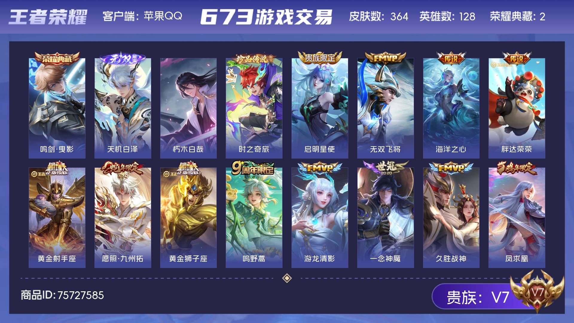 V7 皮肤364 英雄128 非凡王者 荣耀典藏2 无双皮肤1 珍品传说2 传说13 其他皮肤353