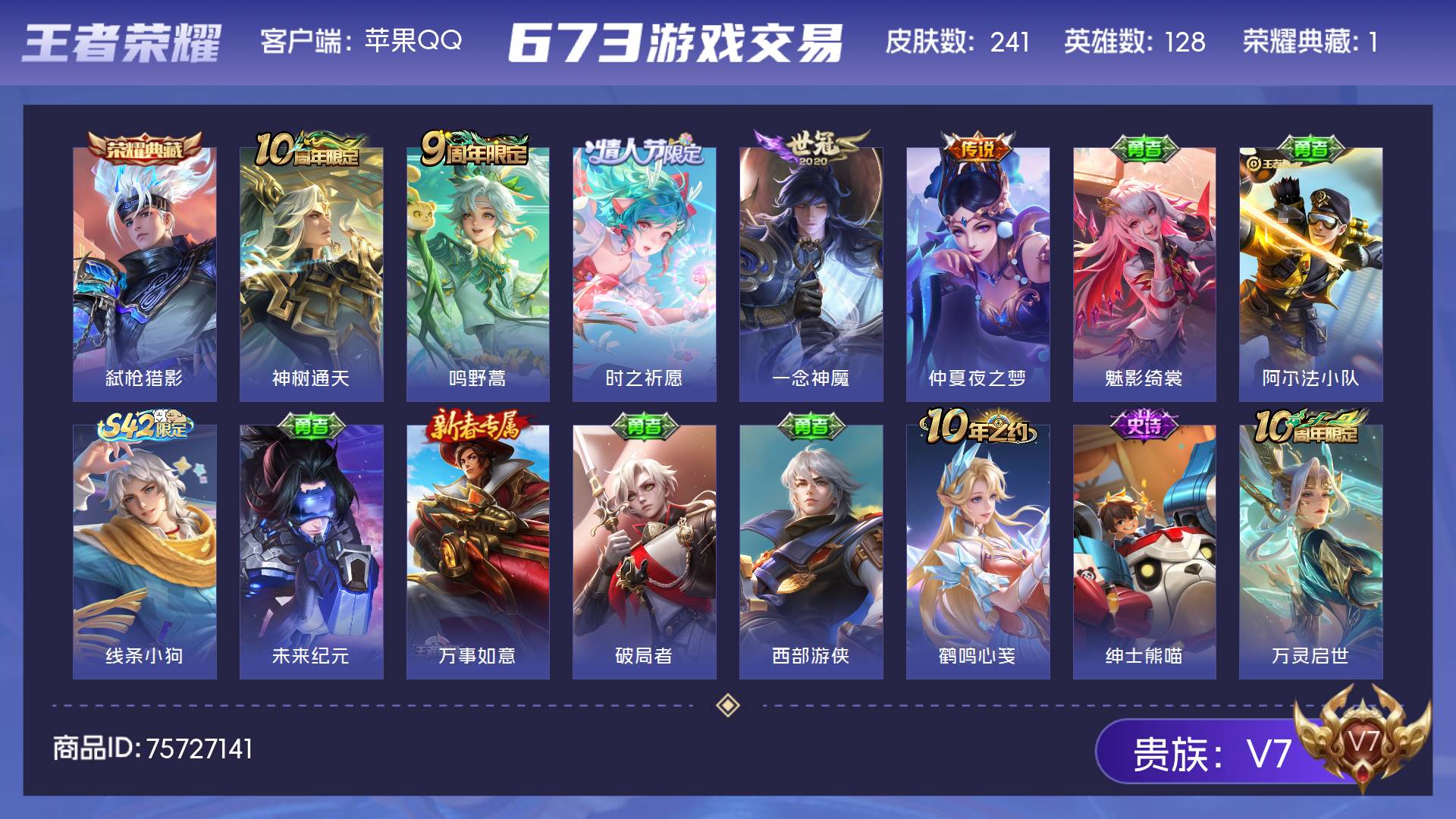 V7 皮肤241 英雄128 永恒钻石 荣耀典藏1 星传说2 传说5 其他皮肤241
