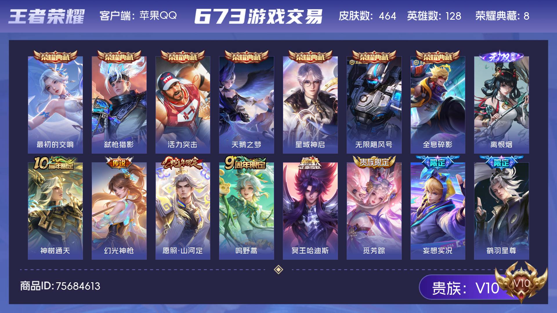 V10 皮肤464 英雄128 至尊星耀 荣耀典藏8 无双皮肤1 传说53 其他皮肤408