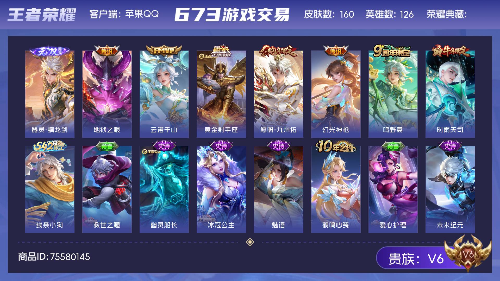 V6 皮肤160 英雄126 永恒钻石 无双皮肤1 星传说1 传说7 其他皮肤157