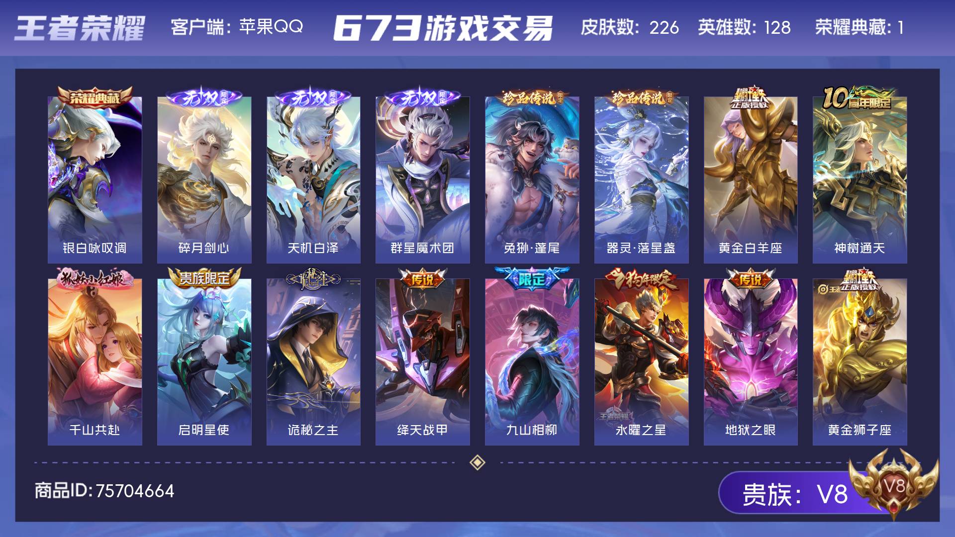 V8 皮肤226 英雄128 荣耀王者 荣耀典藏1 无双皮肤3 珍品传说2 传说20 其他皮肤206