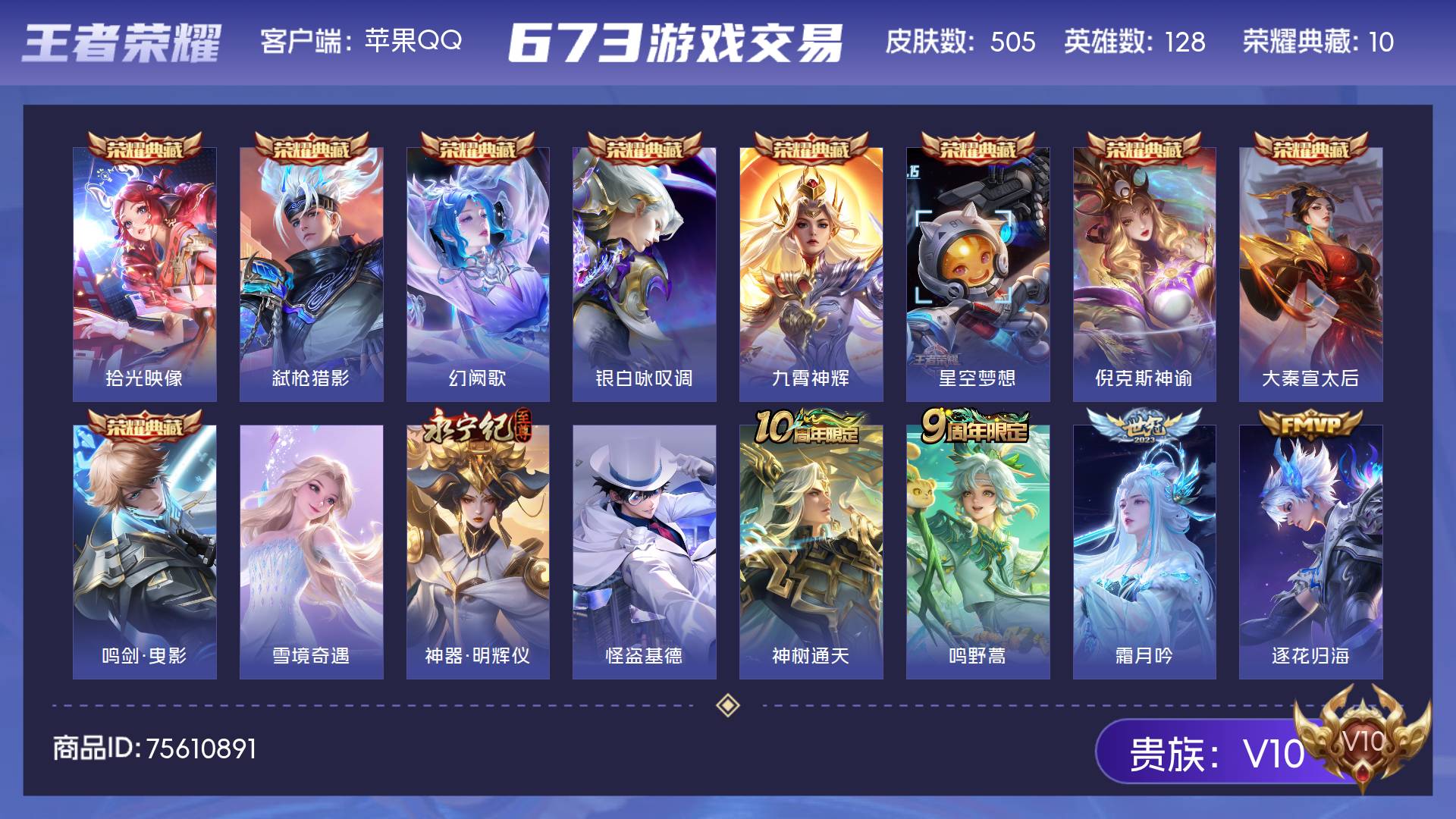 V10 皮肤505 英雄128 无双王者 荣耀典藏10 无双皮肤2 珍品传说1 传说64 其他皮肤431