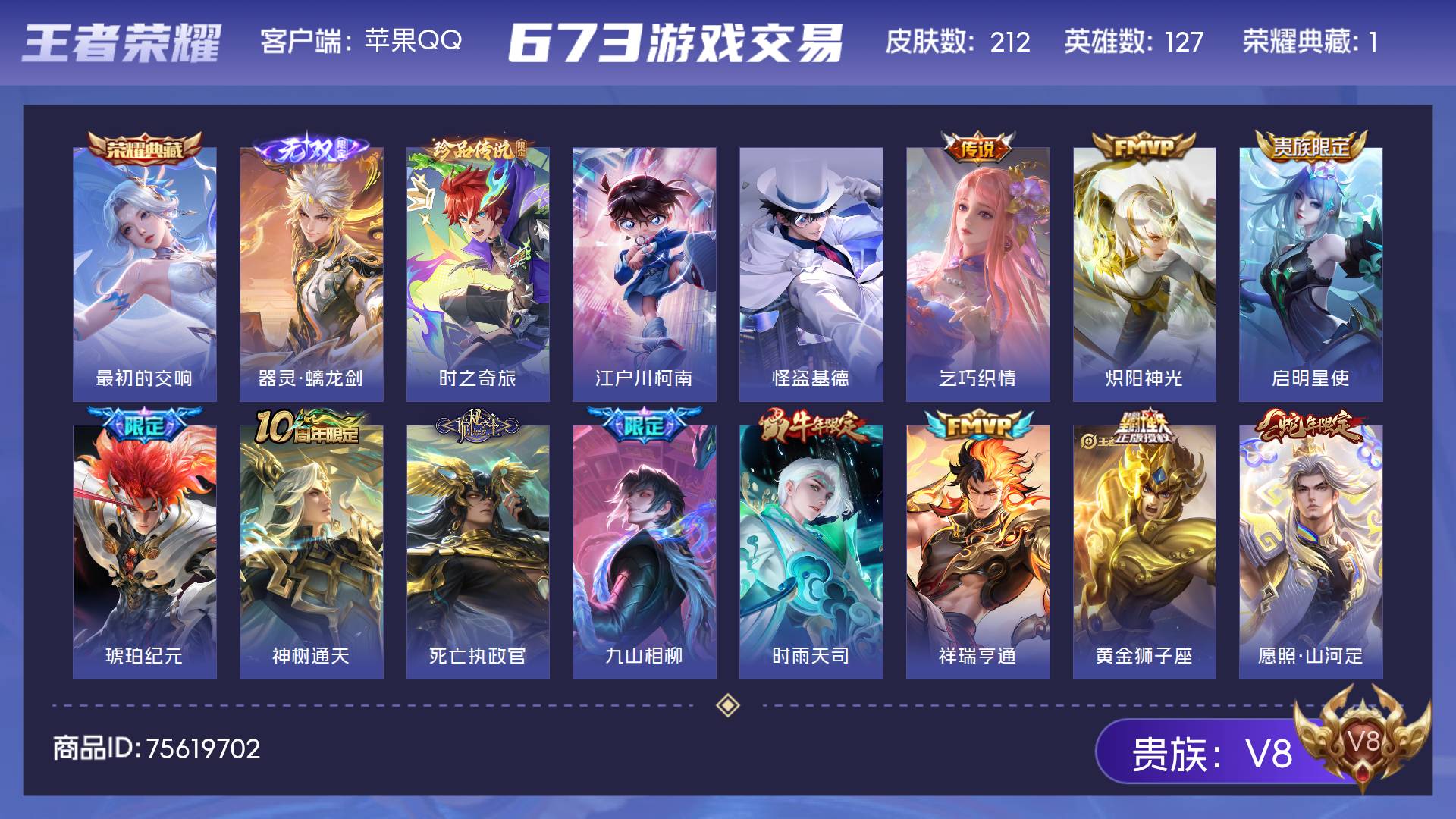 V8 皮肤212 英雄127 永恒钻石 荣耀典藏1 无双皮肤1 珍品传说3 传说17 其他皮肤193