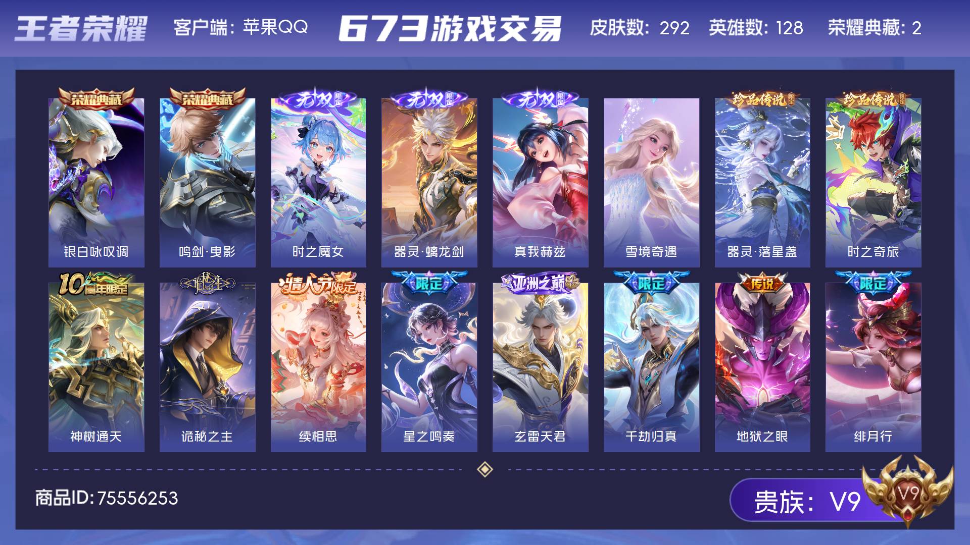 V9 皮肤292 英雄128 荣耀黄金 荣耀典藏2 无双皮肤4 珍品传说2 星传说2 传说27 其他皮肤263