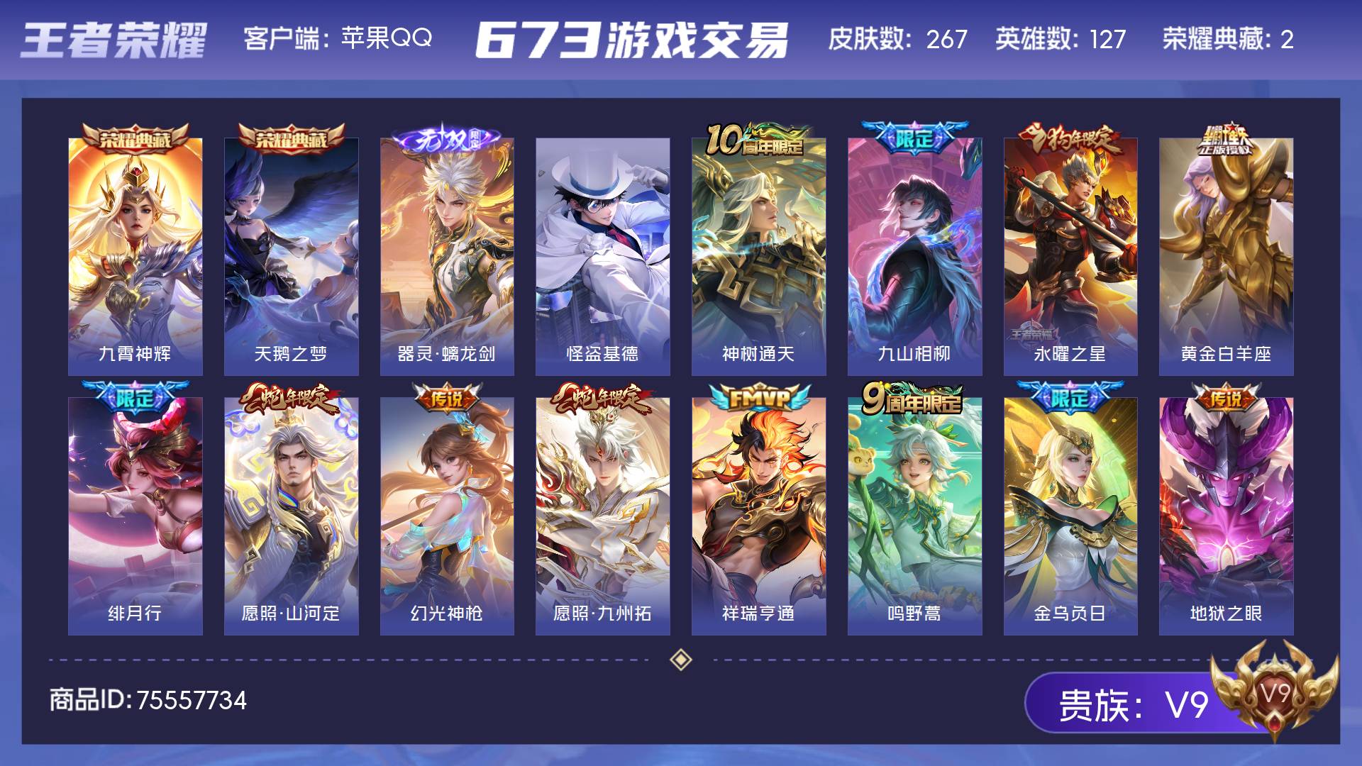 V9 皮肤267 英雄127 最强王者 荣耀典藏2 无双皮肤1 珍品传说1 星传说1 传说18 其他皮肤251