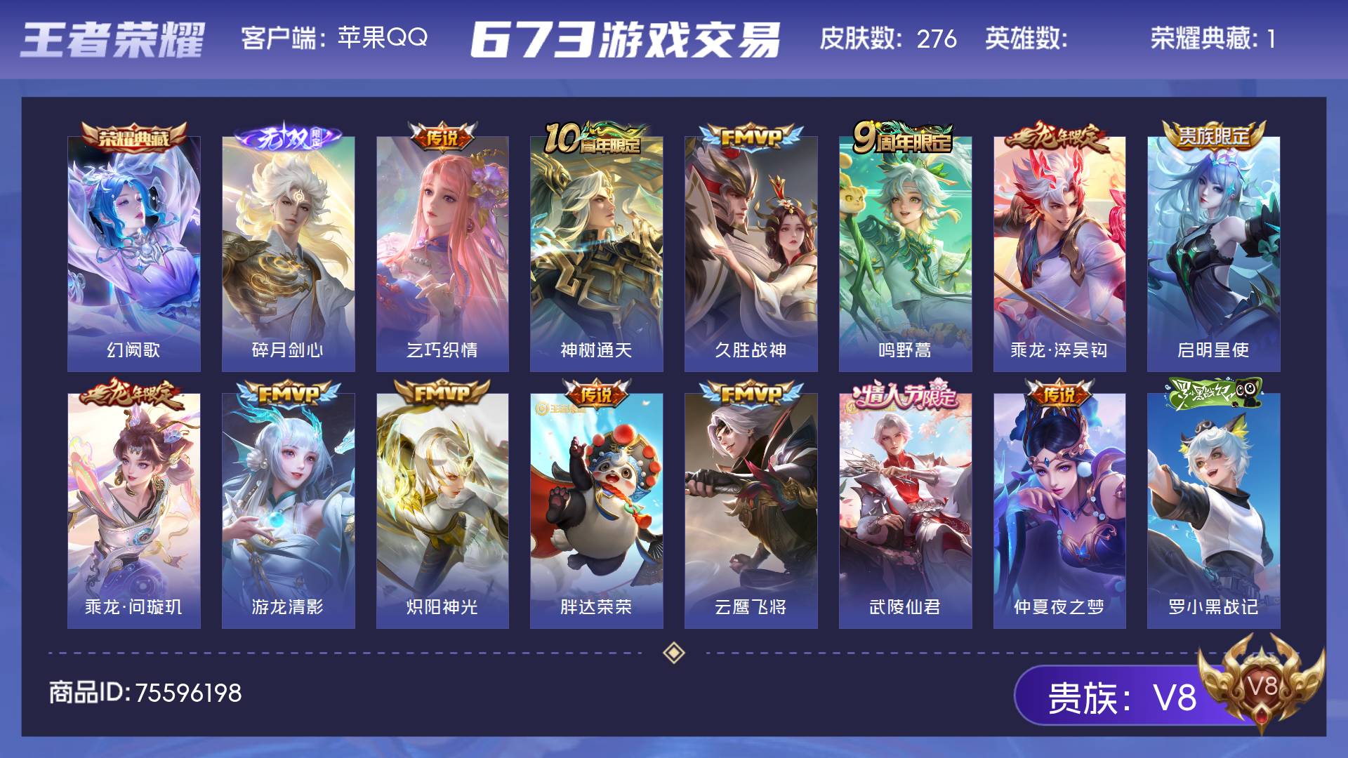 苹果QQ/绝世王者/291皮肤/123英雄/1典藏/0珍品无双/1无双/3珍品