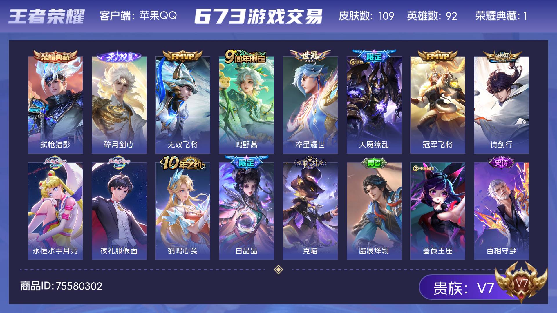 V7 皮肤109 英雄92 最强王者 荣耀典藏1 无双皮肤1 传说8 其他皮肤105