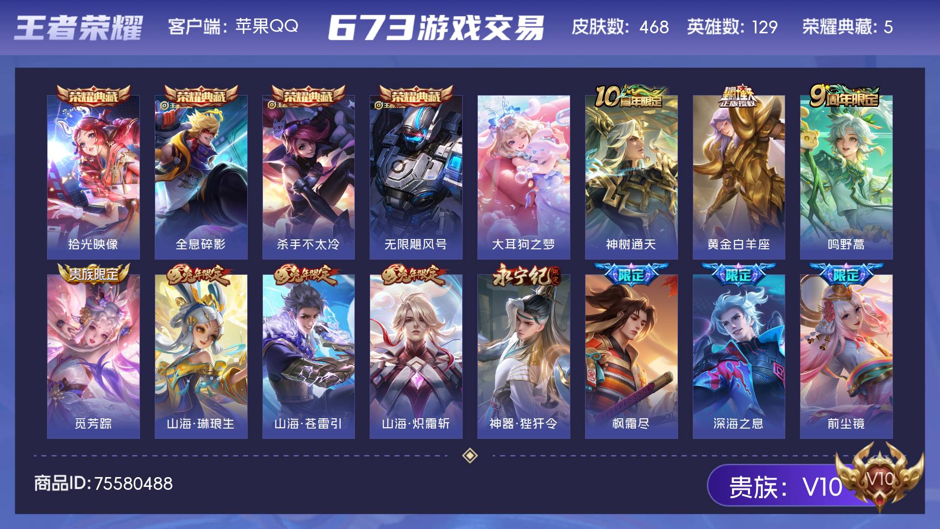 V10 皮肤468 英雄129 非凡王者 荣耀典藏5 珍品传说1 传说35 其他皮肤432