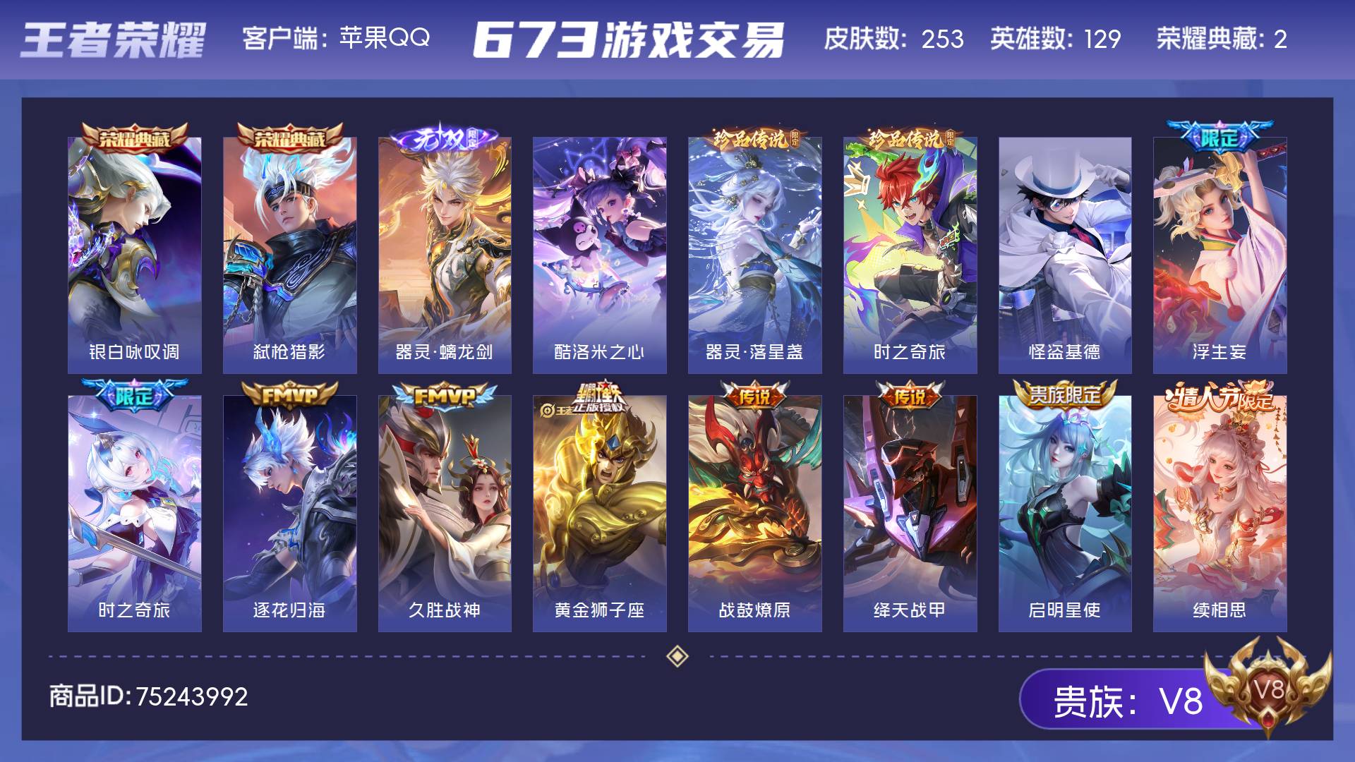 V8 皮肤253 英雄129 至尊星耀 荣耀典藏2 无双皮肤1 珍品传说4 传说23 其他皮肤229