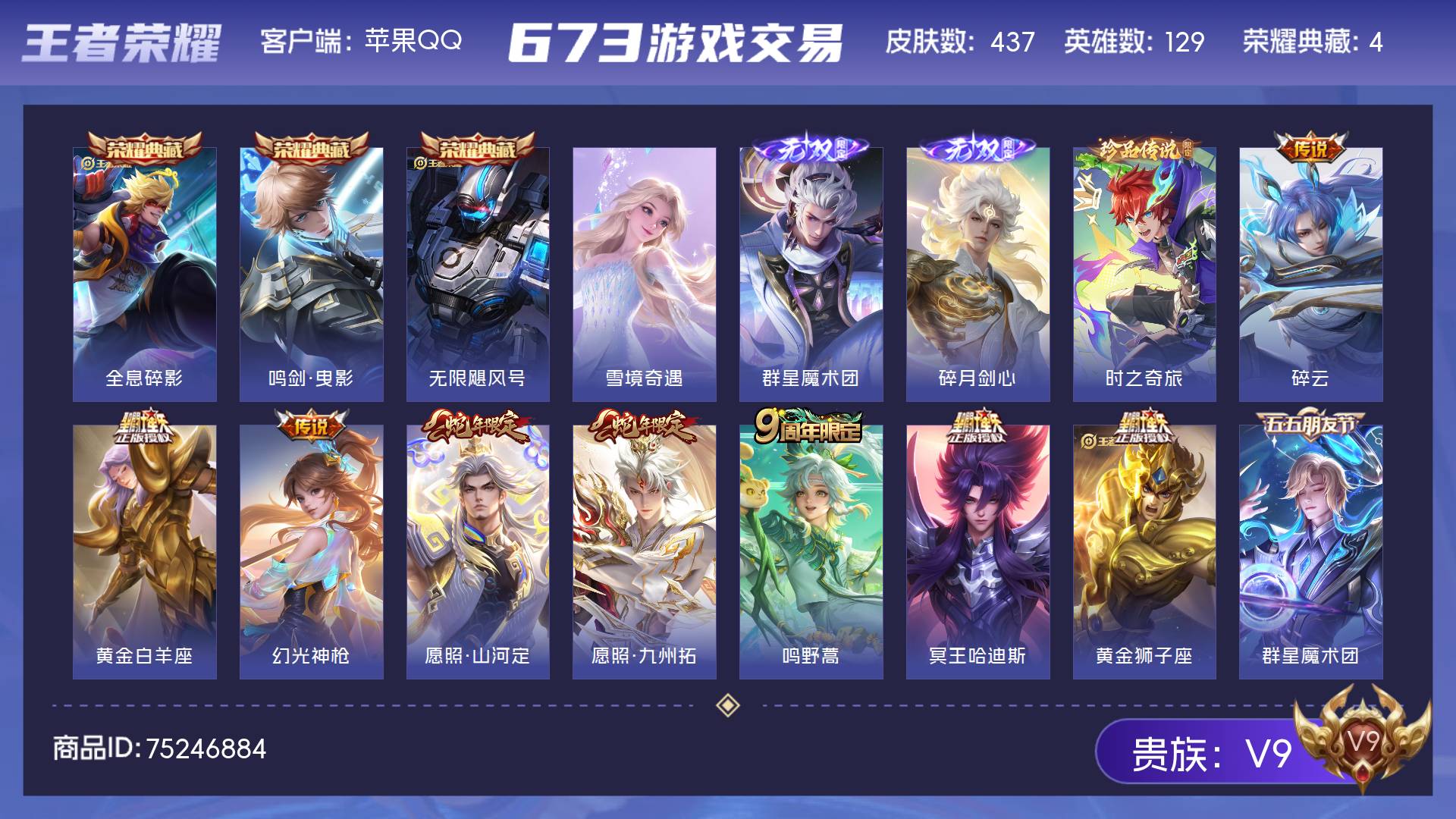 V9 皮肤437 英雄129 最强王者 荣耀典藏4 无双皮肤3 珍品传说1 传说32 其他皮肤404