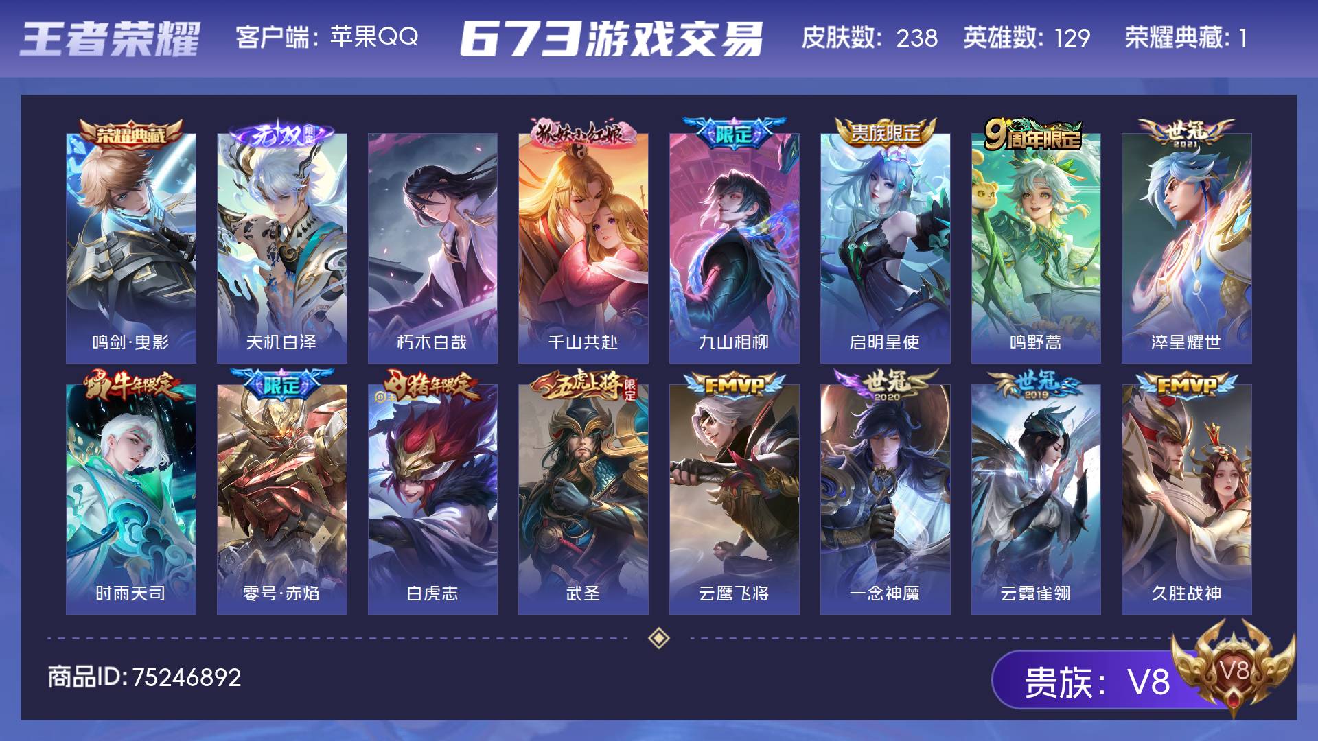 V8 皮肤238 英雄129 绝世王者 荣耀典藏1 无双皮肤1 珍品传说1 传说18 其他皮肤223
