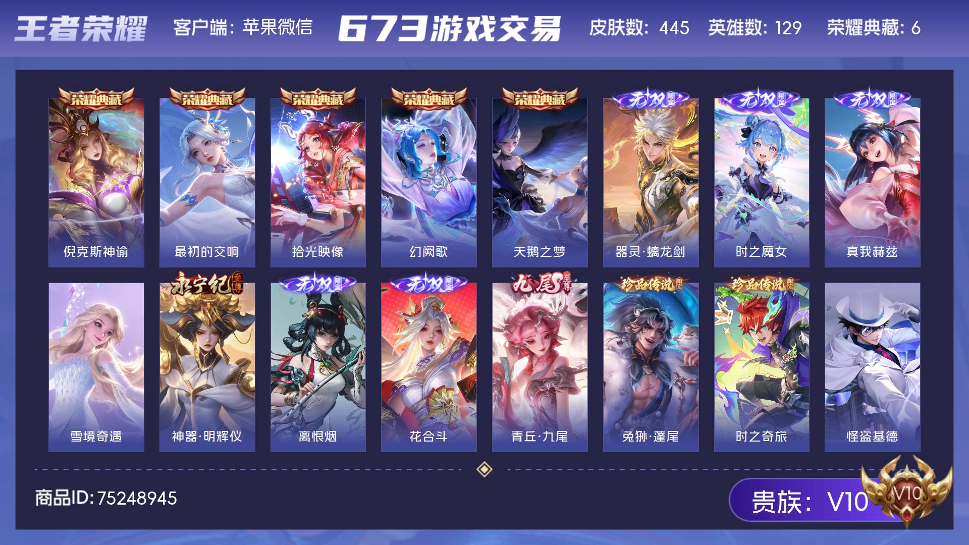 V10 皮肤445 英雄129 永恒钻石 荣耀典藏6 无双皮肤8 珍品传说4 星传说3 传说56 其他皮肤376