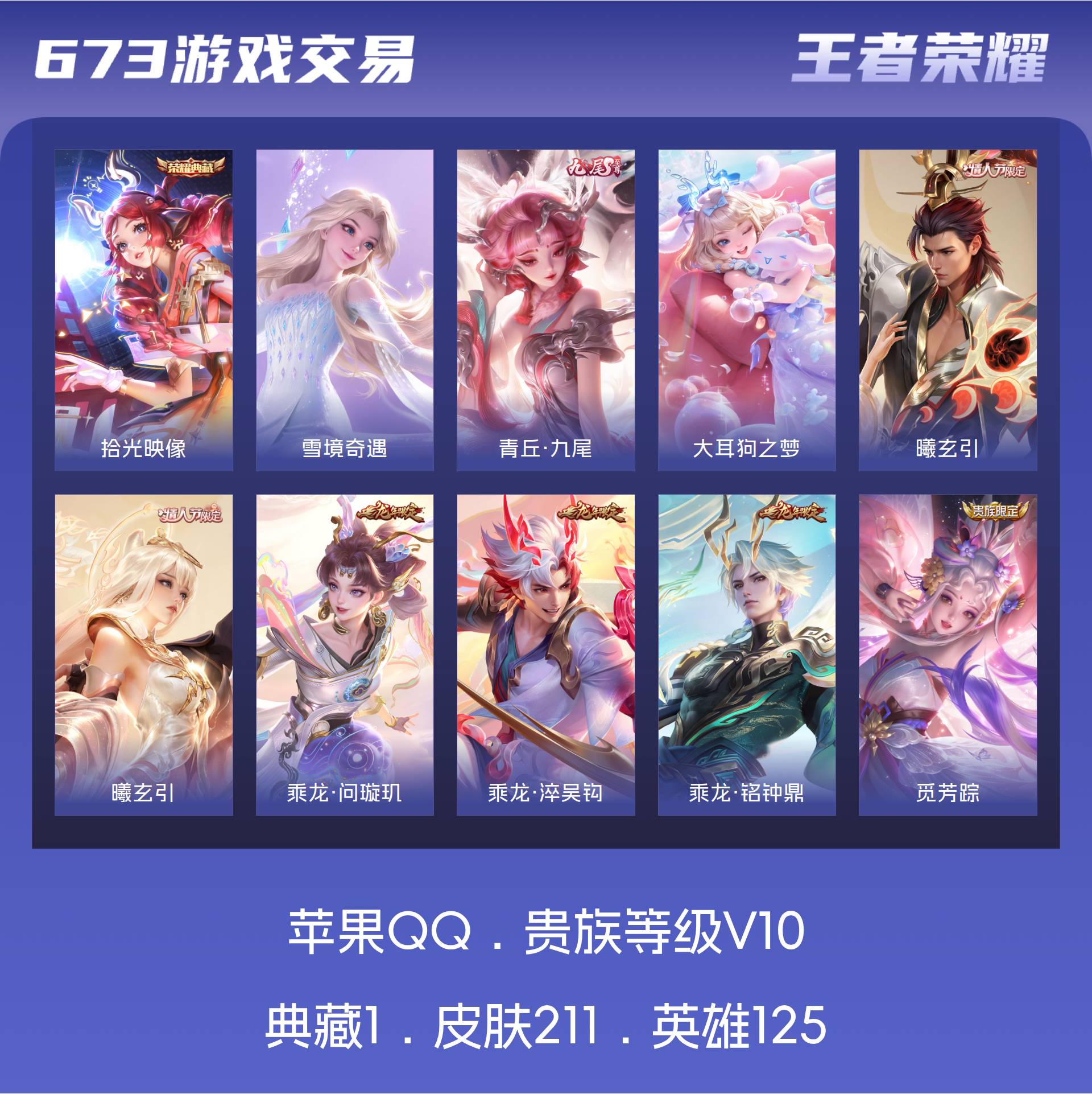 V10 皮肤211 英雄125 荣耀王者 荣耀典藏1 无双皮肤2 珍品传说1 星传说2 传说25 其他皮肤85