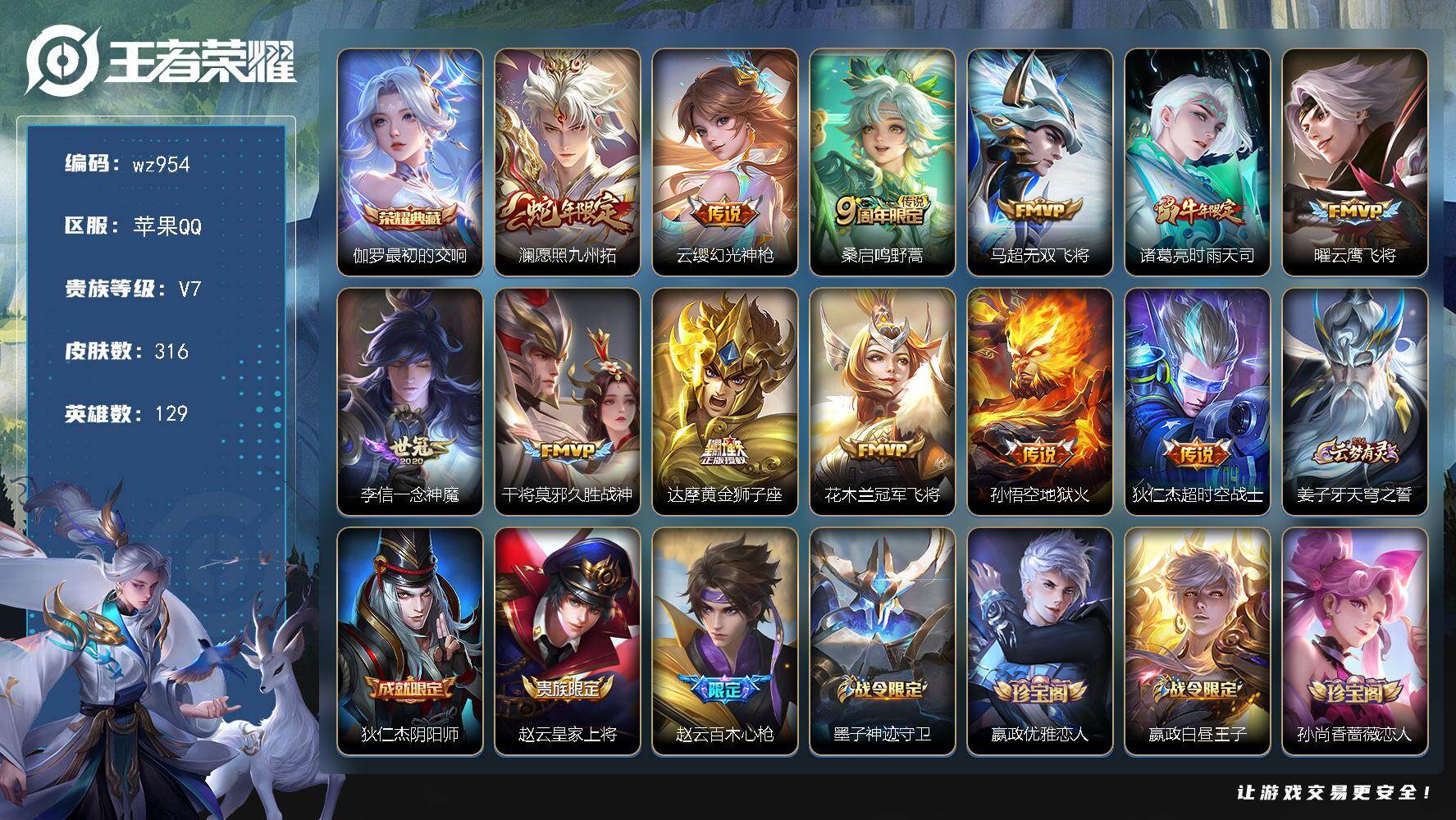 苹果Q-V7-永恒钻石II段位-129英雄-316皮肤-1典藏皮肤-12传说-