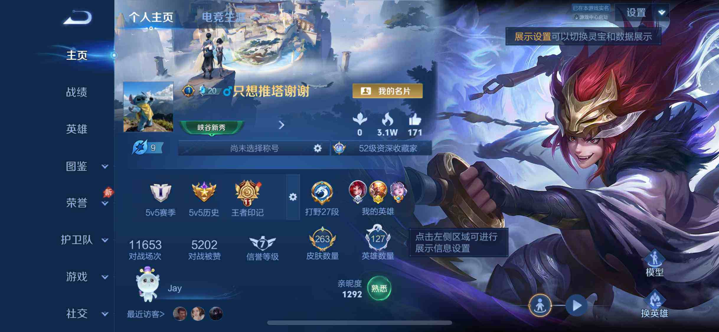 贵族等级: V7 英雄数: 128 皮肤数: 241 荣耀水晶: 鸣剑·曳影