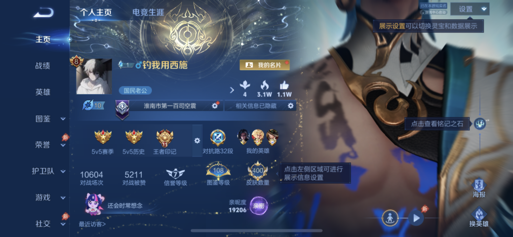 【金标妲己】贵族等级: V10 英雄数: 124 皮肤数: 415 荣耀水晶: