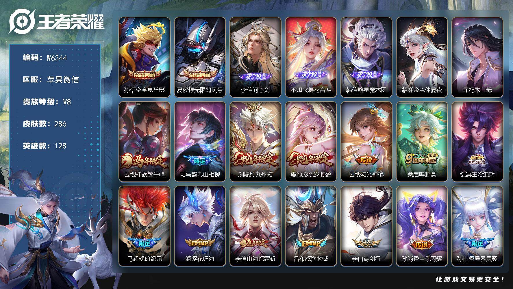 苹果WX-V9-至尊星耀II段位-128英雄-338皮肤-6典藏皮肤-1典藏英