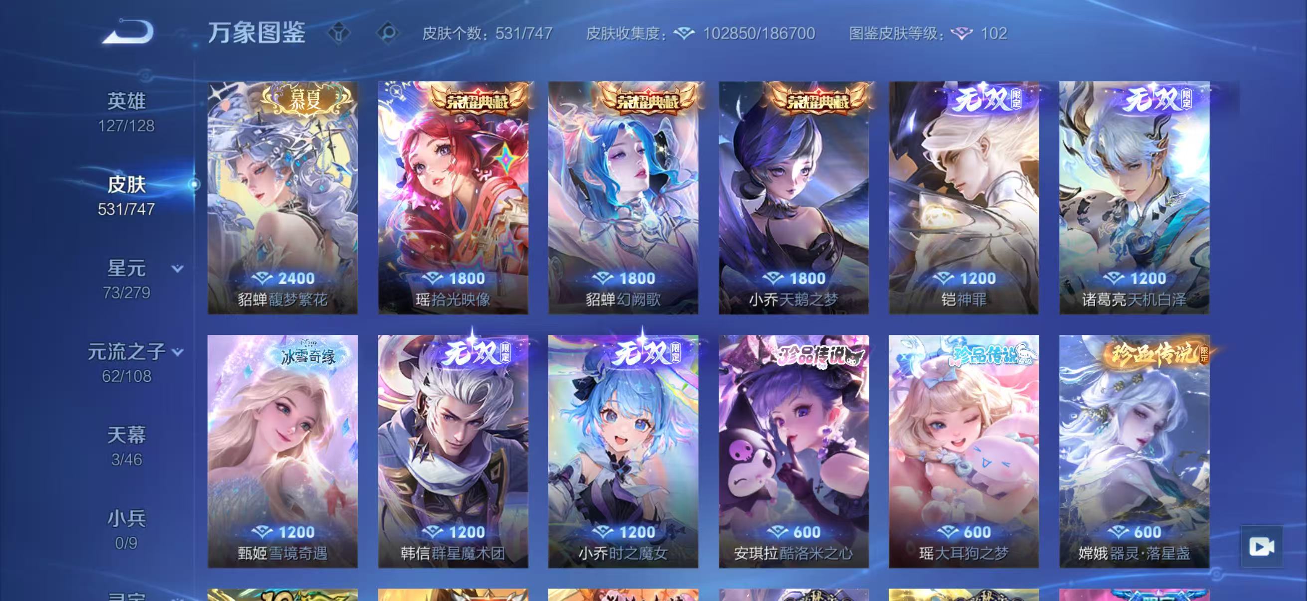 苹果QQ/永恒钻石/256皮肤/124英雄/1典藏/0珍品无双/3无双/5珍品传说/15传说/73史