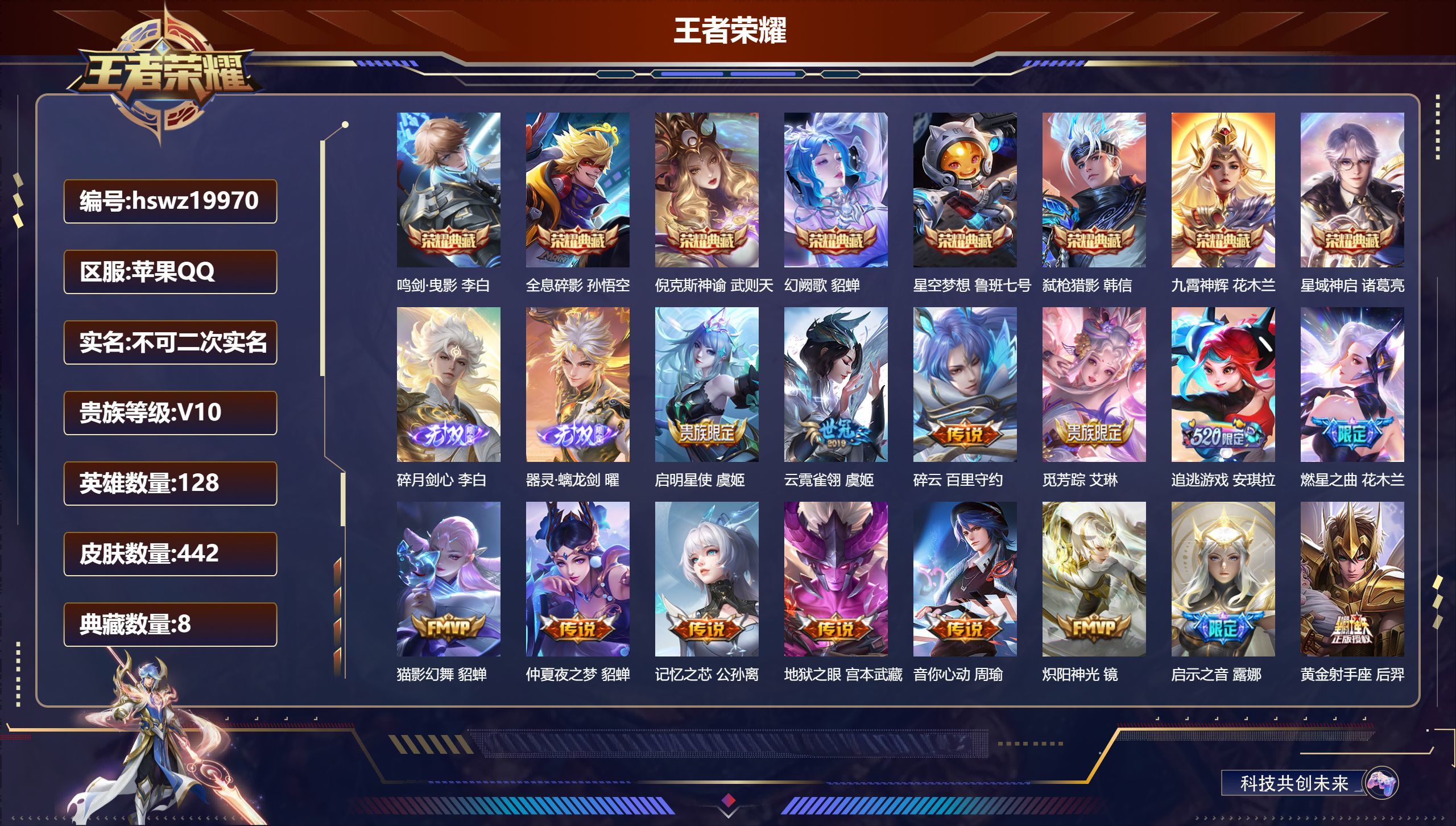 苹果QQ/无双王者/442皮肤/128英雄/8典藏/0珍品无双/2无双/0珍品传说/32传说/138