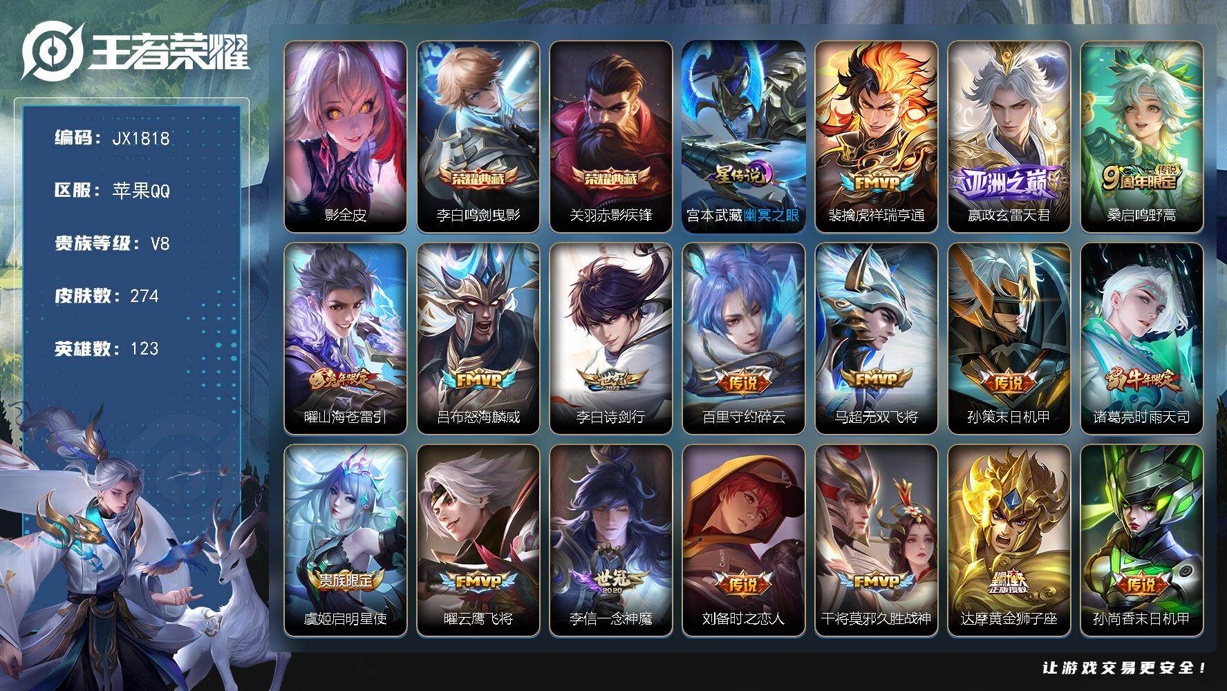HXX1191【男神号274皮肤2典藏1星传说19传说72史诗68限定】苹果Q