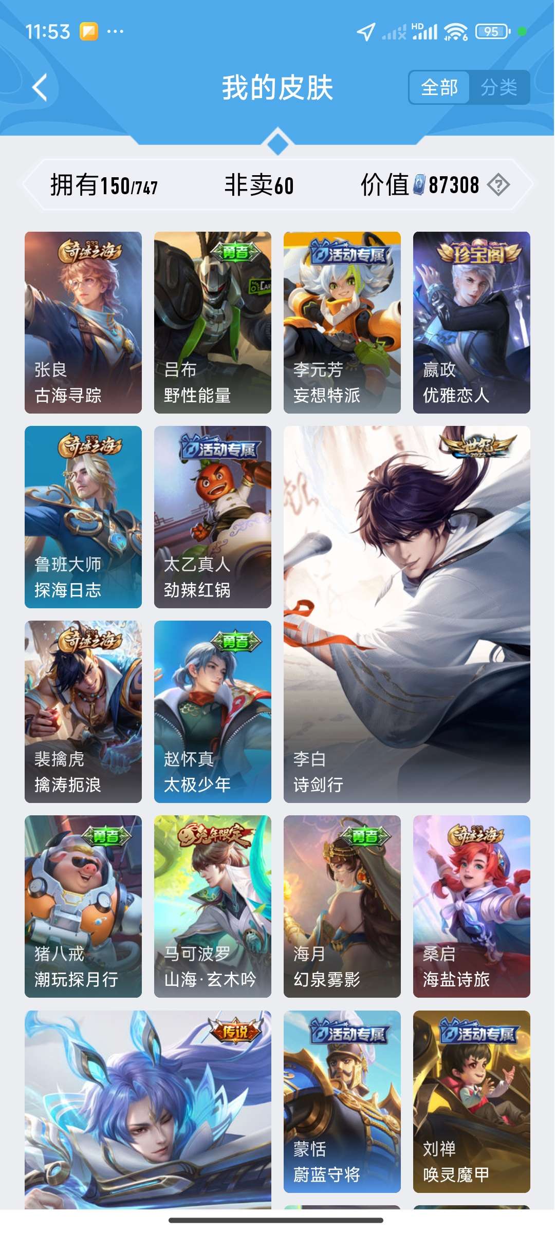 可换绑【V10精品号 金标镜 3典藏 3无双 李白全皮 生肖限定20个 多传说
