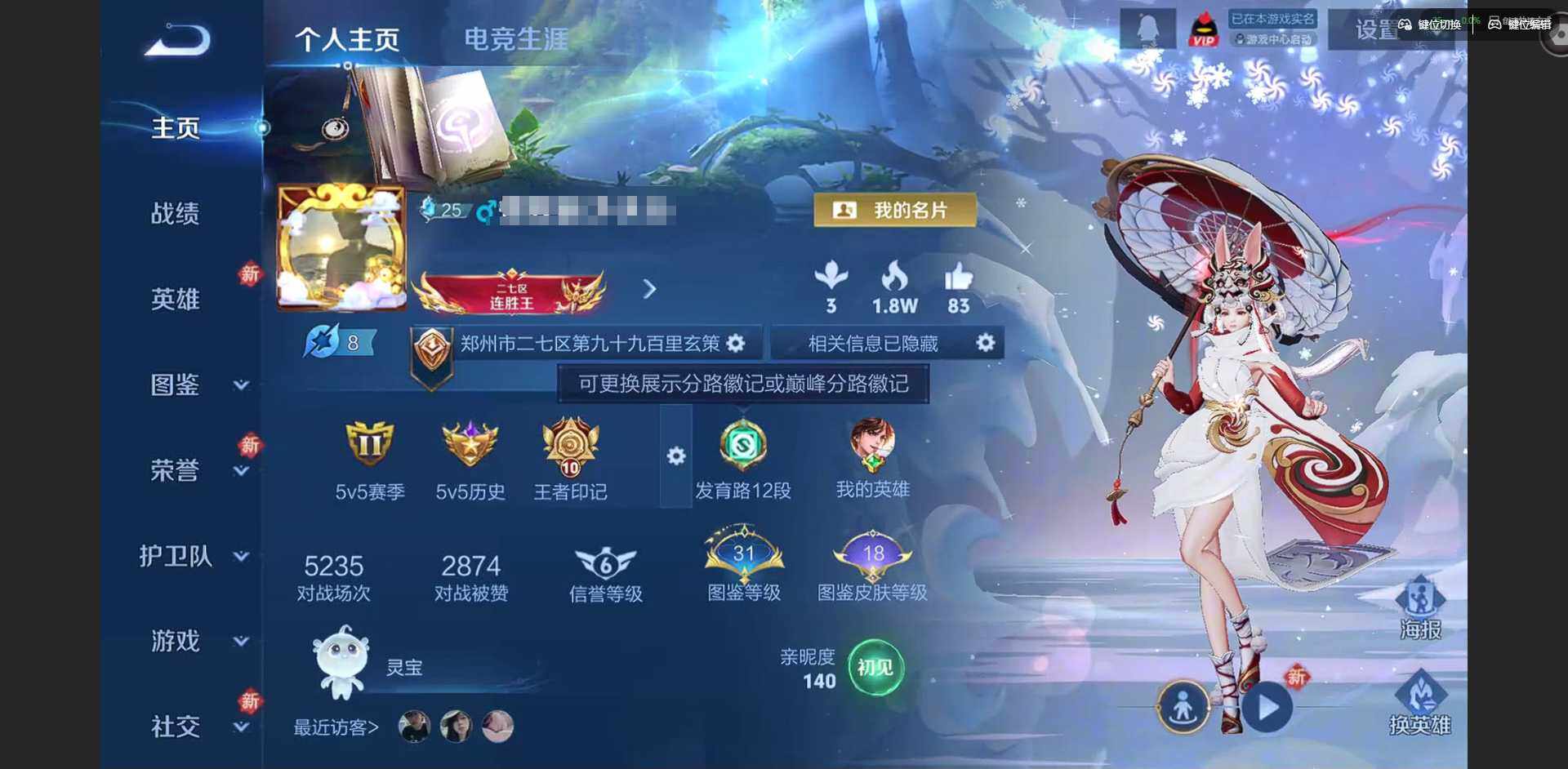 实名: 可修改 贵族等级: V7 英雄数: 124 皮肤数: 161 传说皮: