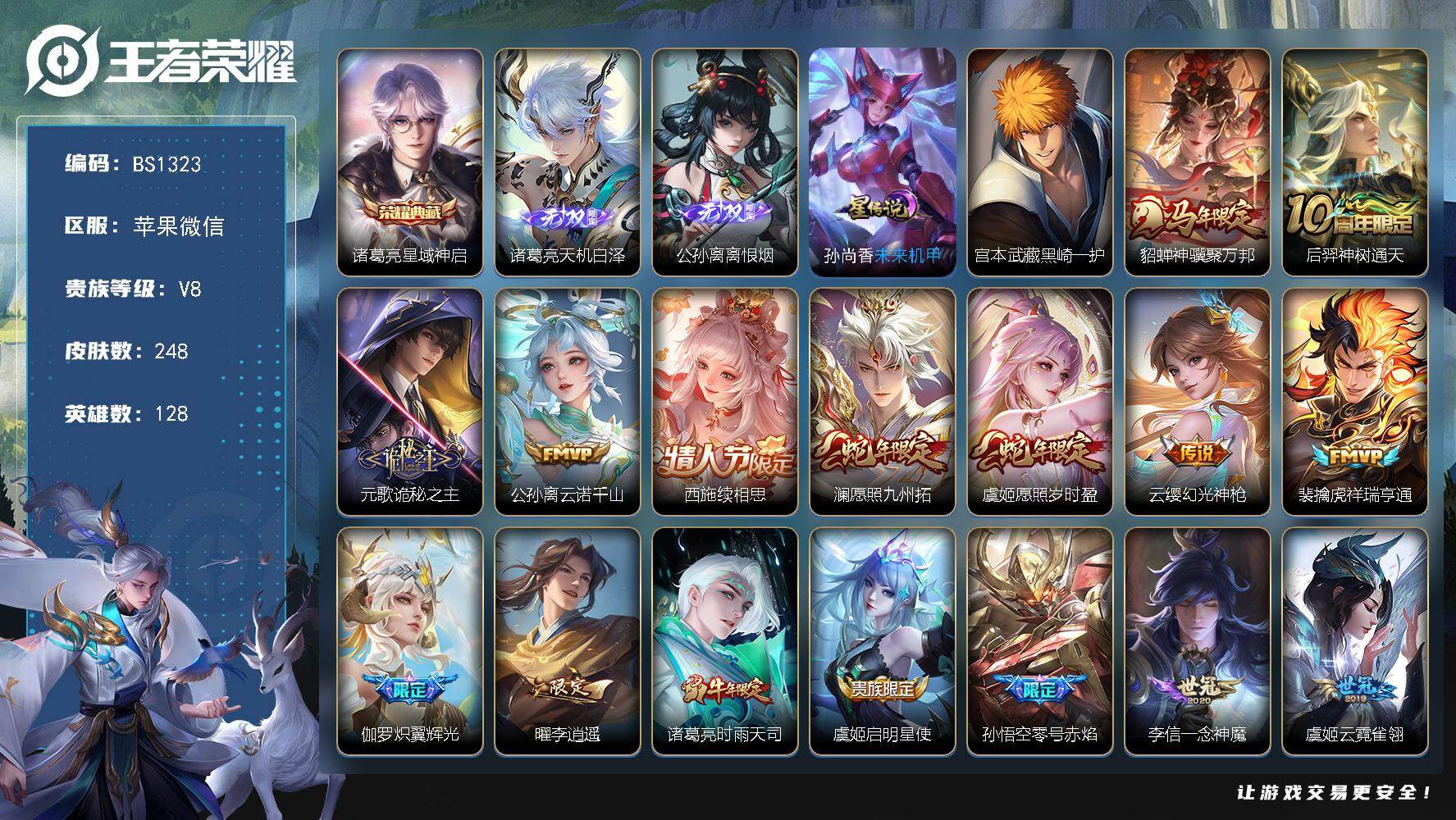 苹果WX-V8-永恒钻石V段位-128英雄-248皮肤-1典藏皮肤-2无双-1