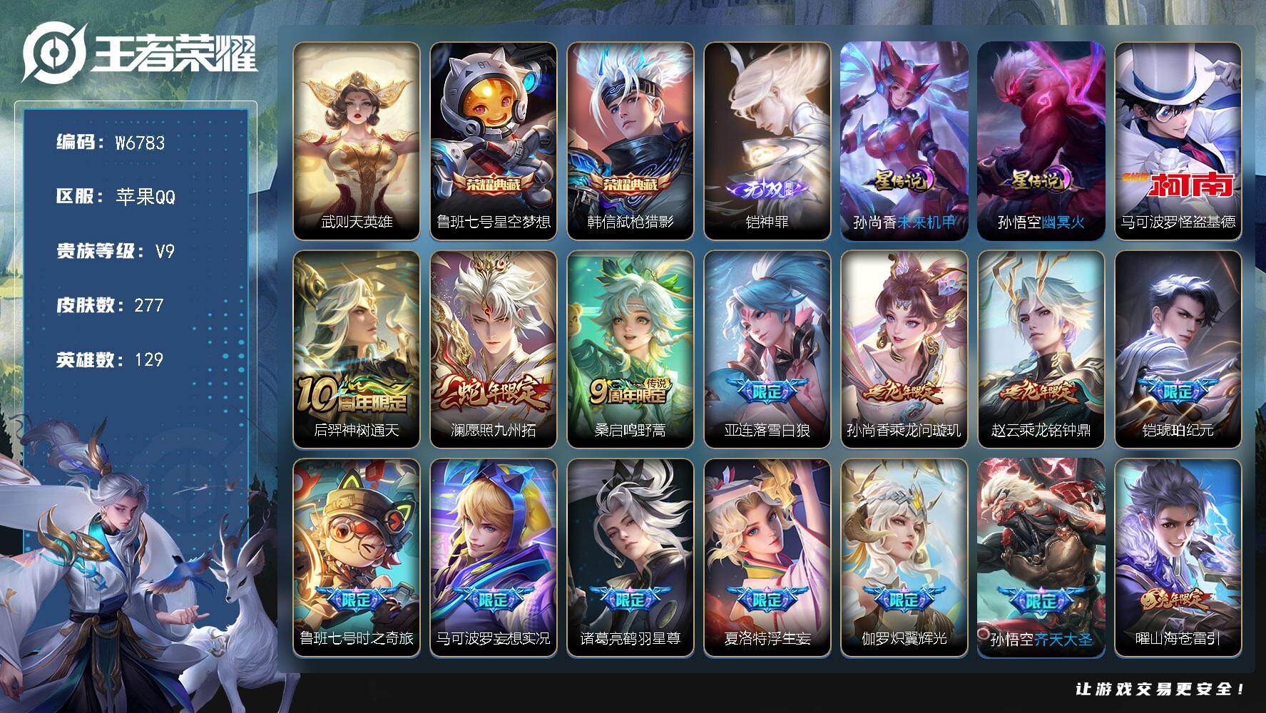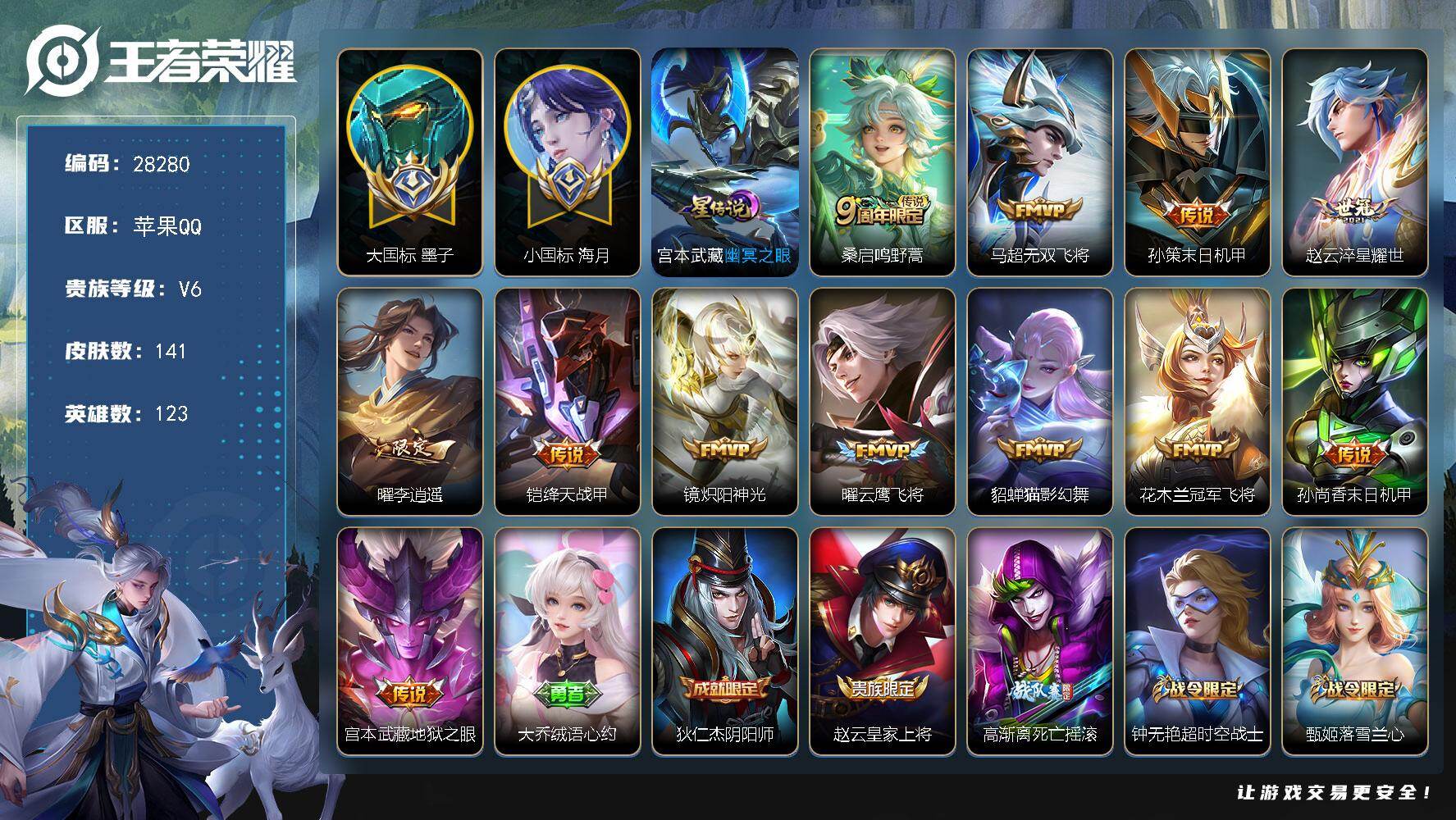 苹果Q-V8-至尊星耀IV段位-128英雄-287皮肤-1典藏皮肤-1无双-2