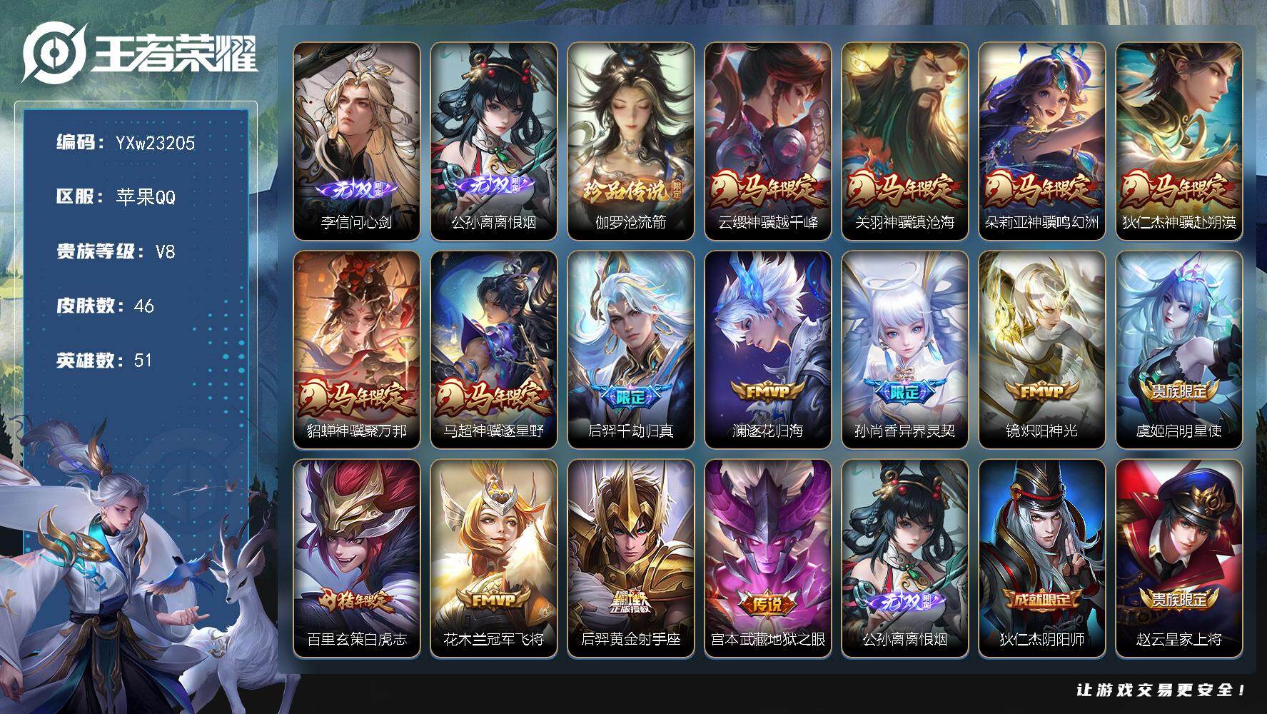 实名: 可修改 贵族等级: V5 英雄数: 48 皮肤数: 36 无双皮: 器