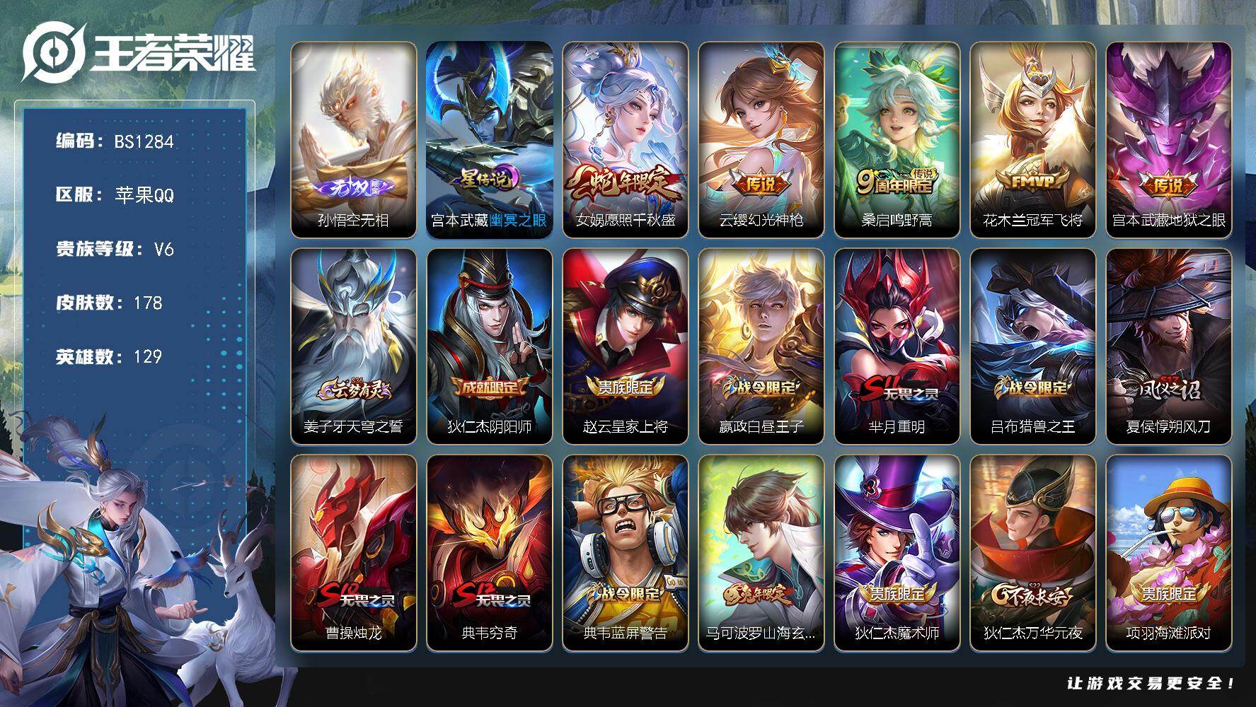 苹果Q-V6-永恒钻石II段位-129英雄-178皮肤-1无双-5传说-37史